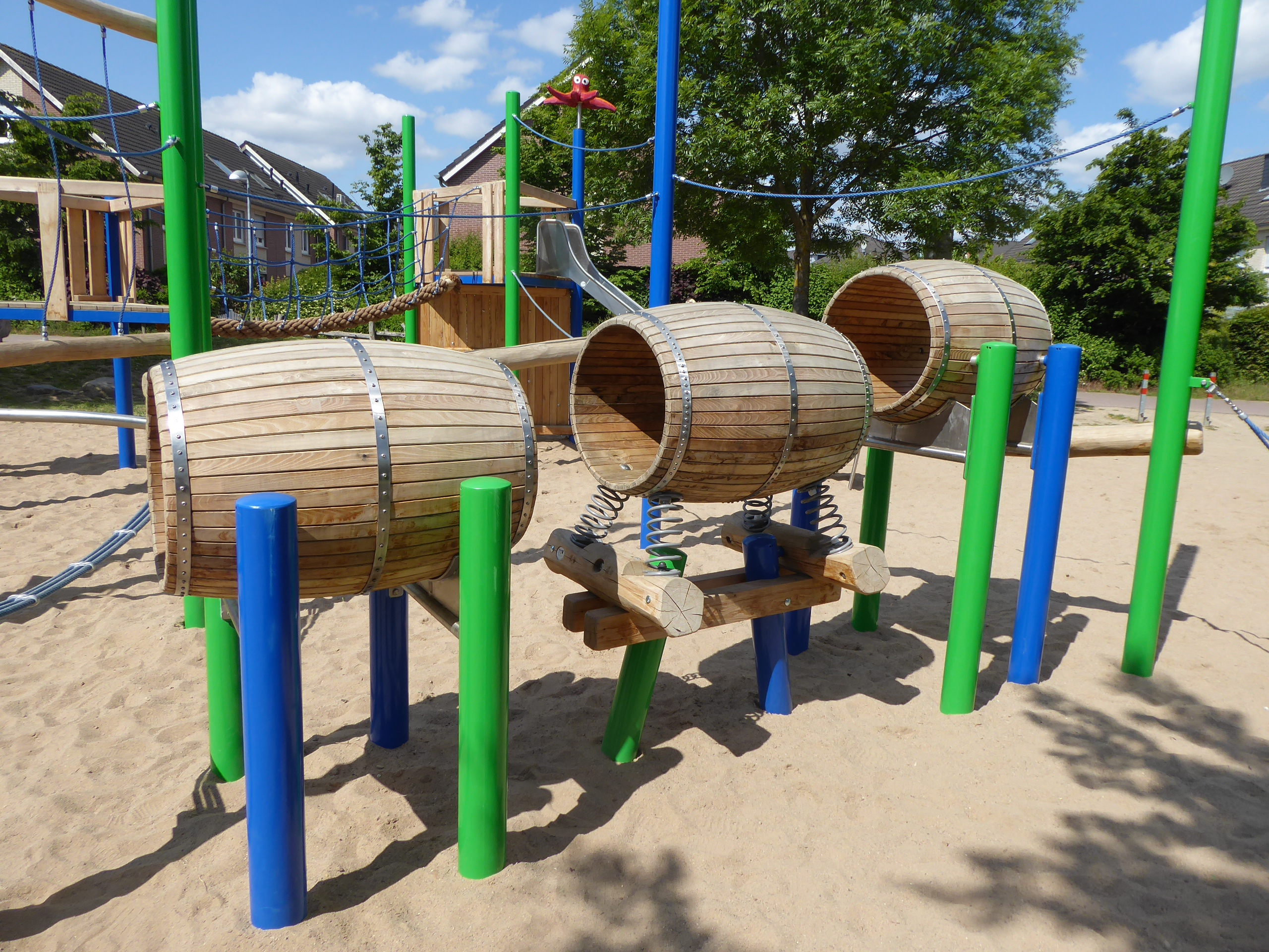 Neben der Vogelnestschaukel gelangen die Kinder über die schwebenden Kletterfelsen mit Hangelseil auf das erste Podest, von dem aus sie über eine Slalomstrecke, Balancierrohren und Bändern zur Fässerbrücke gelangen. Das mittlere Fass wurde auf Federn montiert, damit das klettern durch diese Besonderheit noch spannender gestaltet wird.