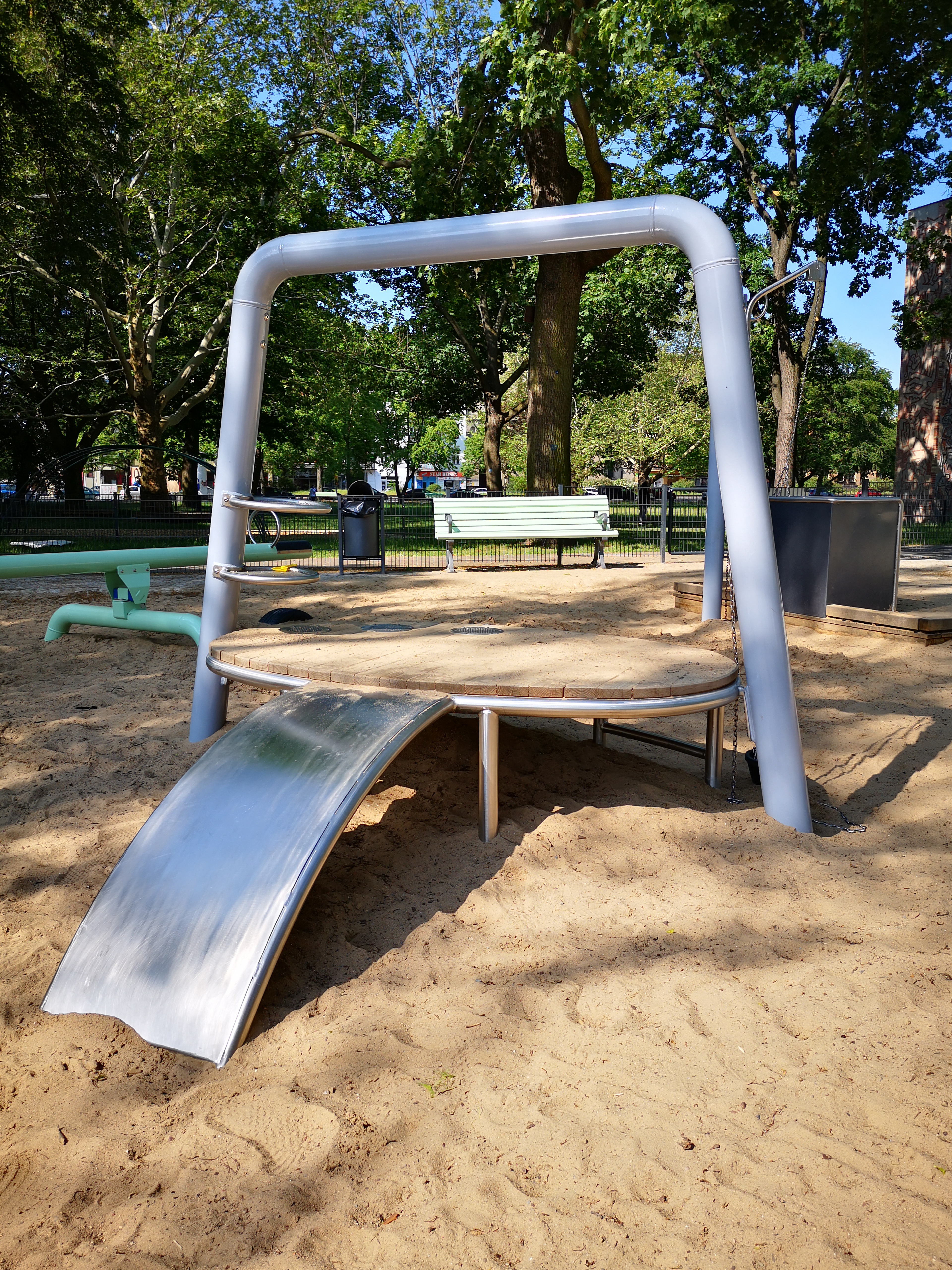Das Sandspielpodest mit Sieben einem Sandaufzug und einer Gleitfläche wird von einem weißen Bogen überzogen.