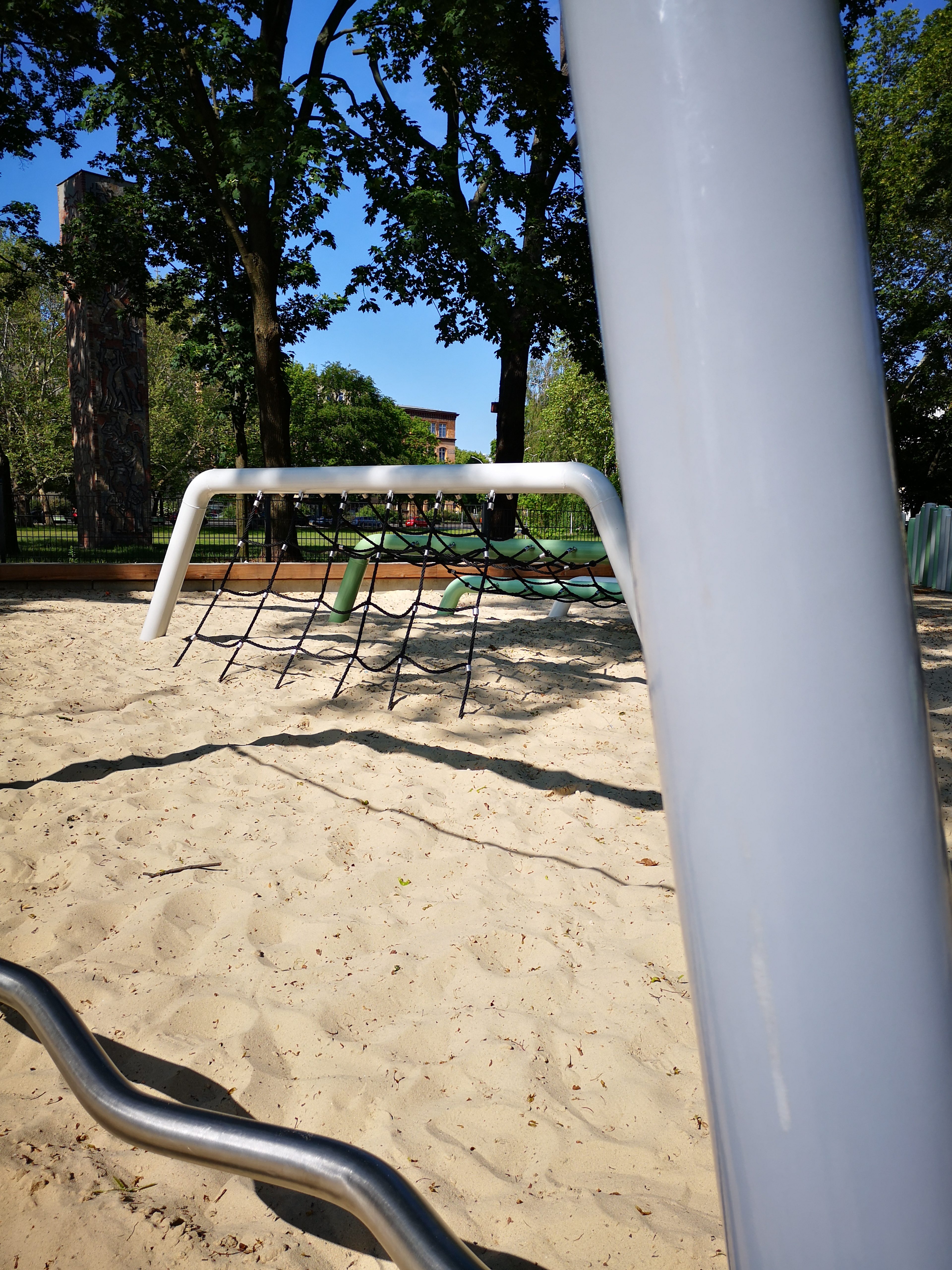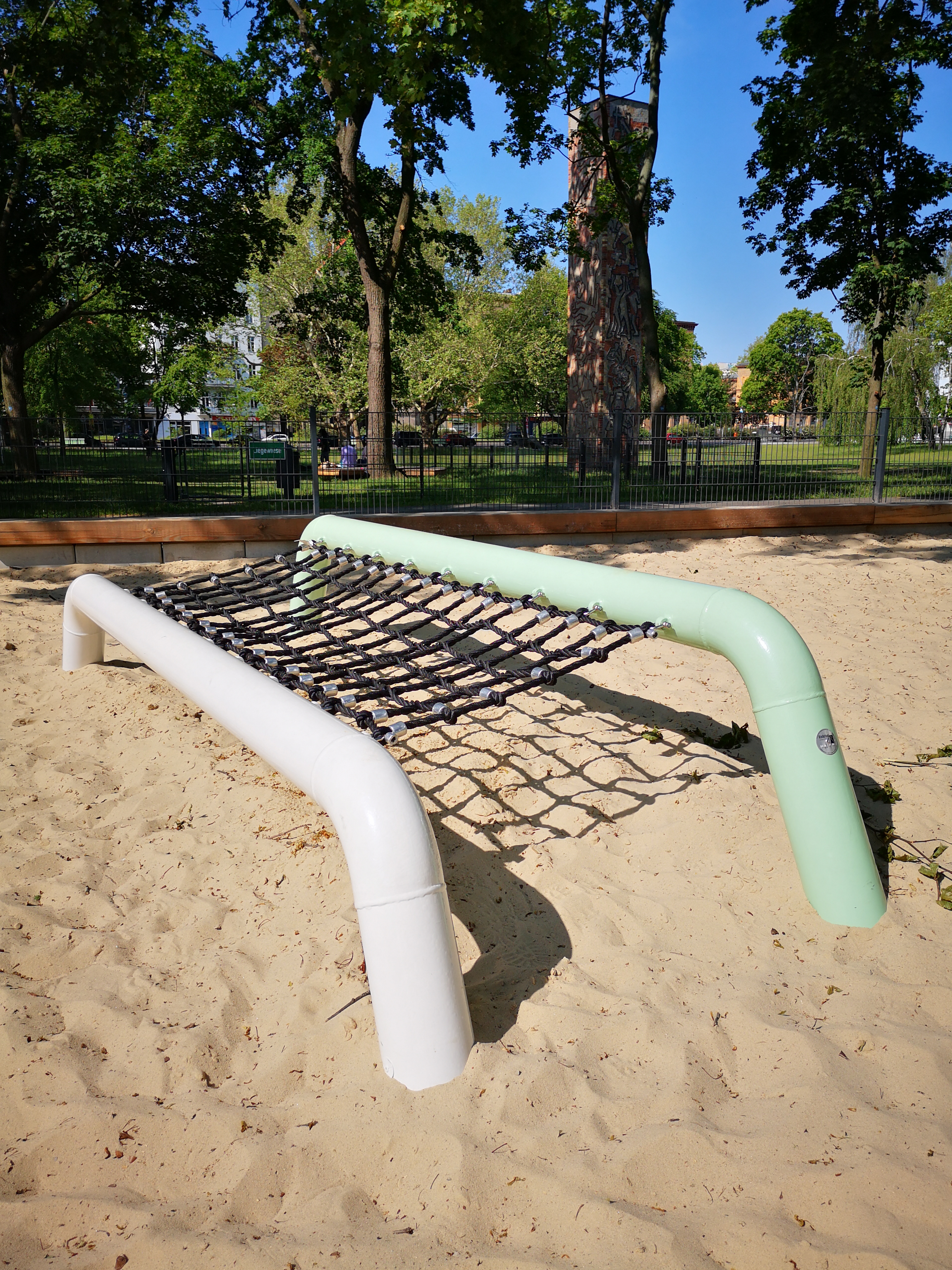 Die großen Netzbögen in kräftigen Grüntönen vermitteln sofort das Gefühl "da will ich hoch klettern". Die Kinder können dabei an einer Seite hochklettern und über ein Kletternetz, das zwischen die Bögen gespannt worden ist, zum nächsten Bogen rüber klettern.