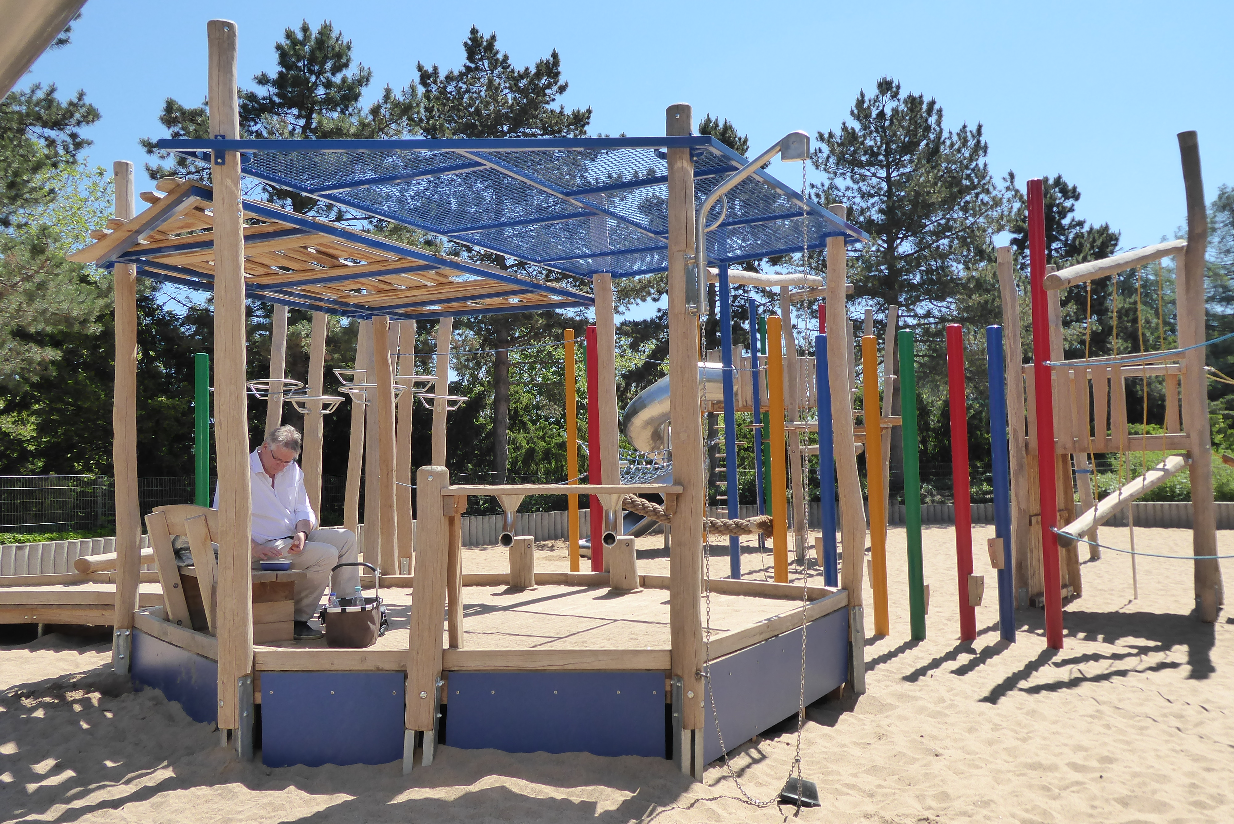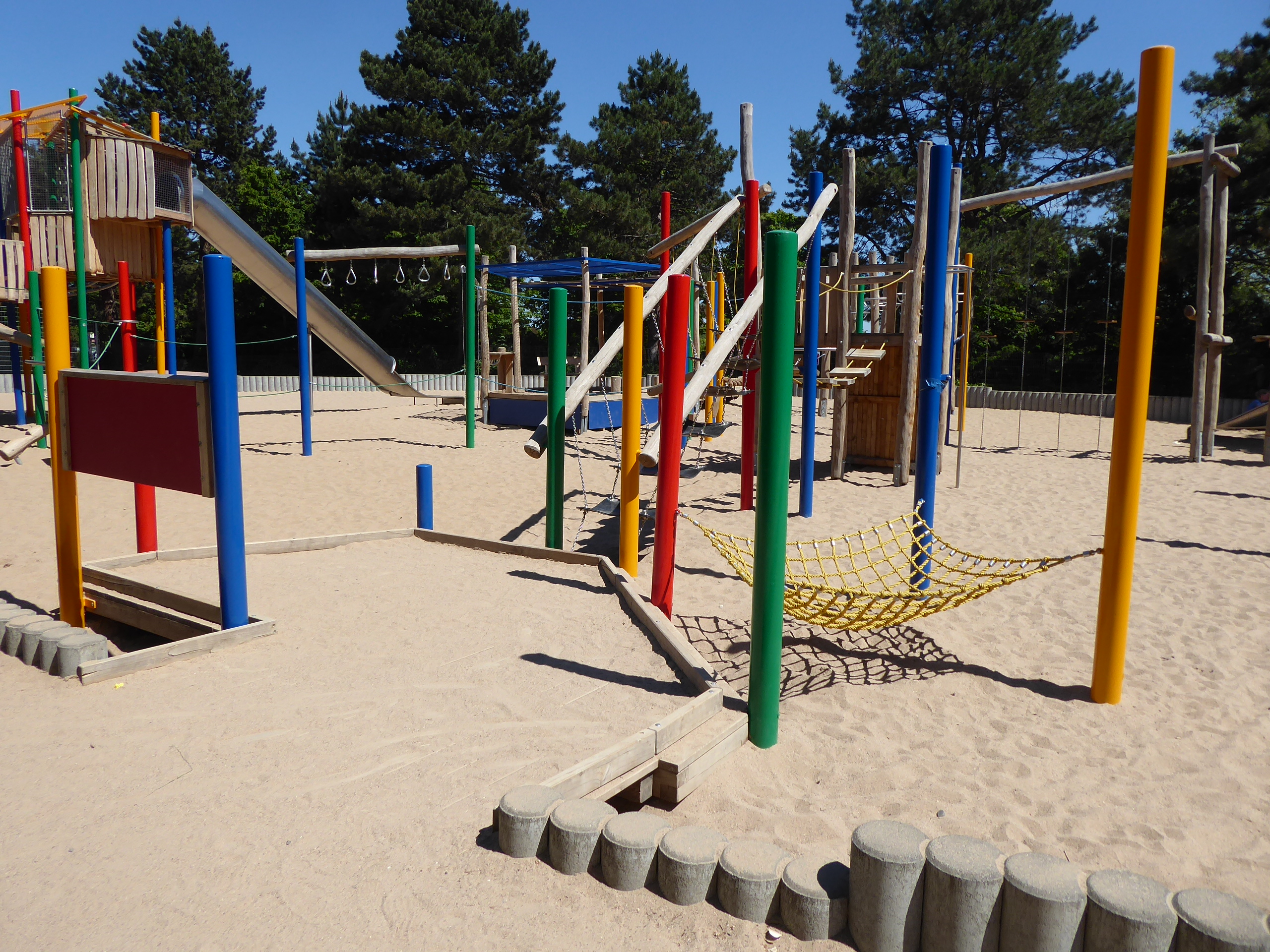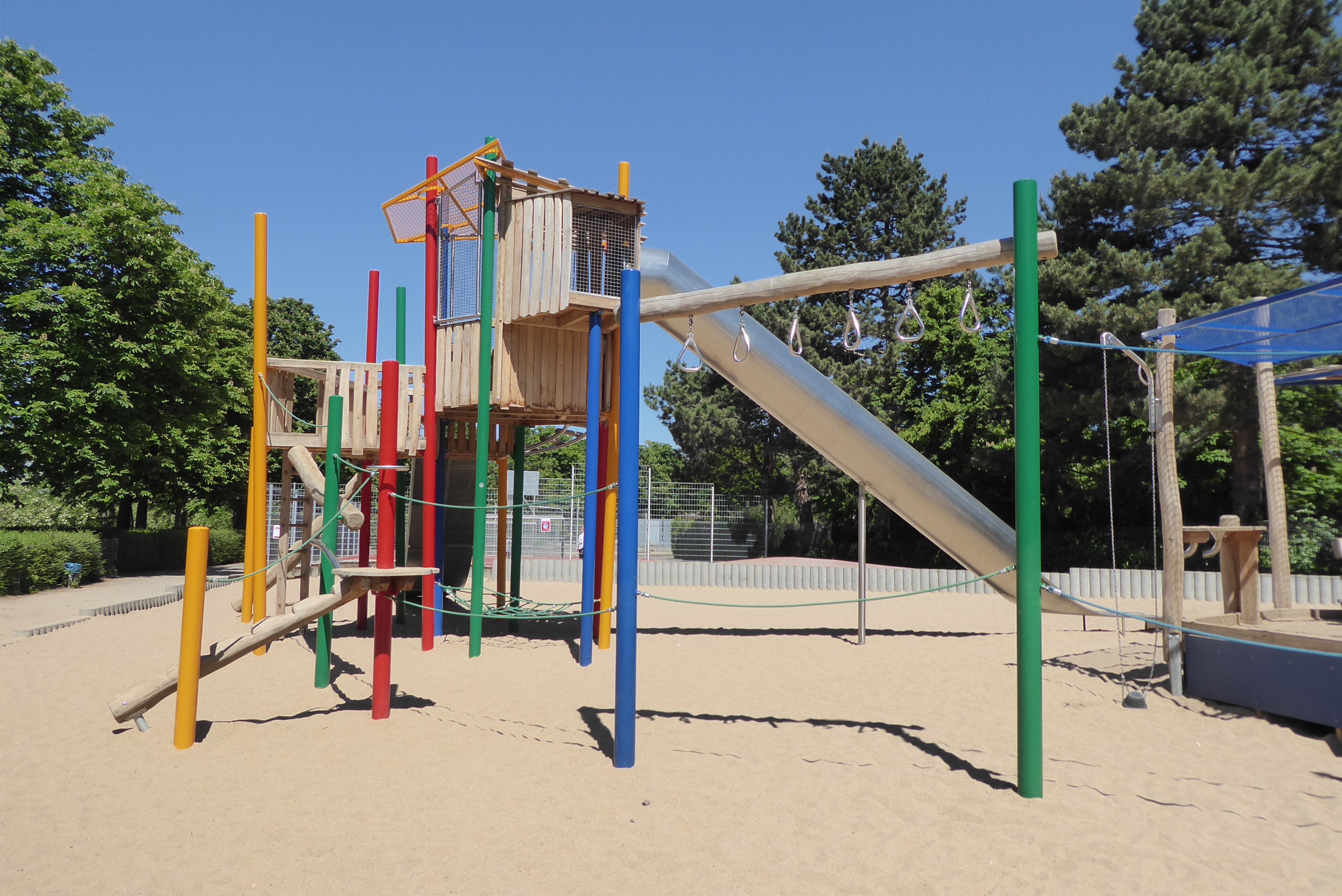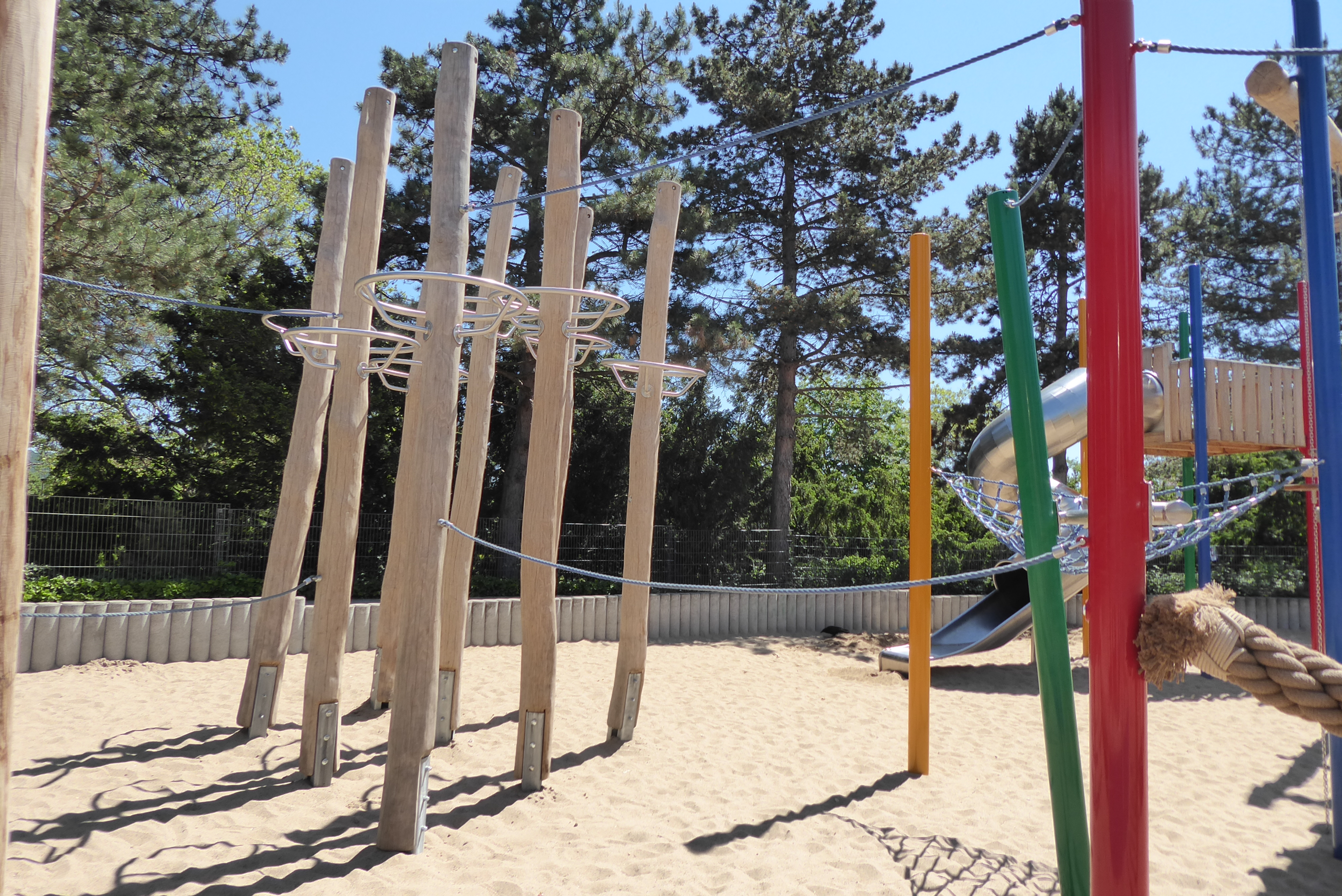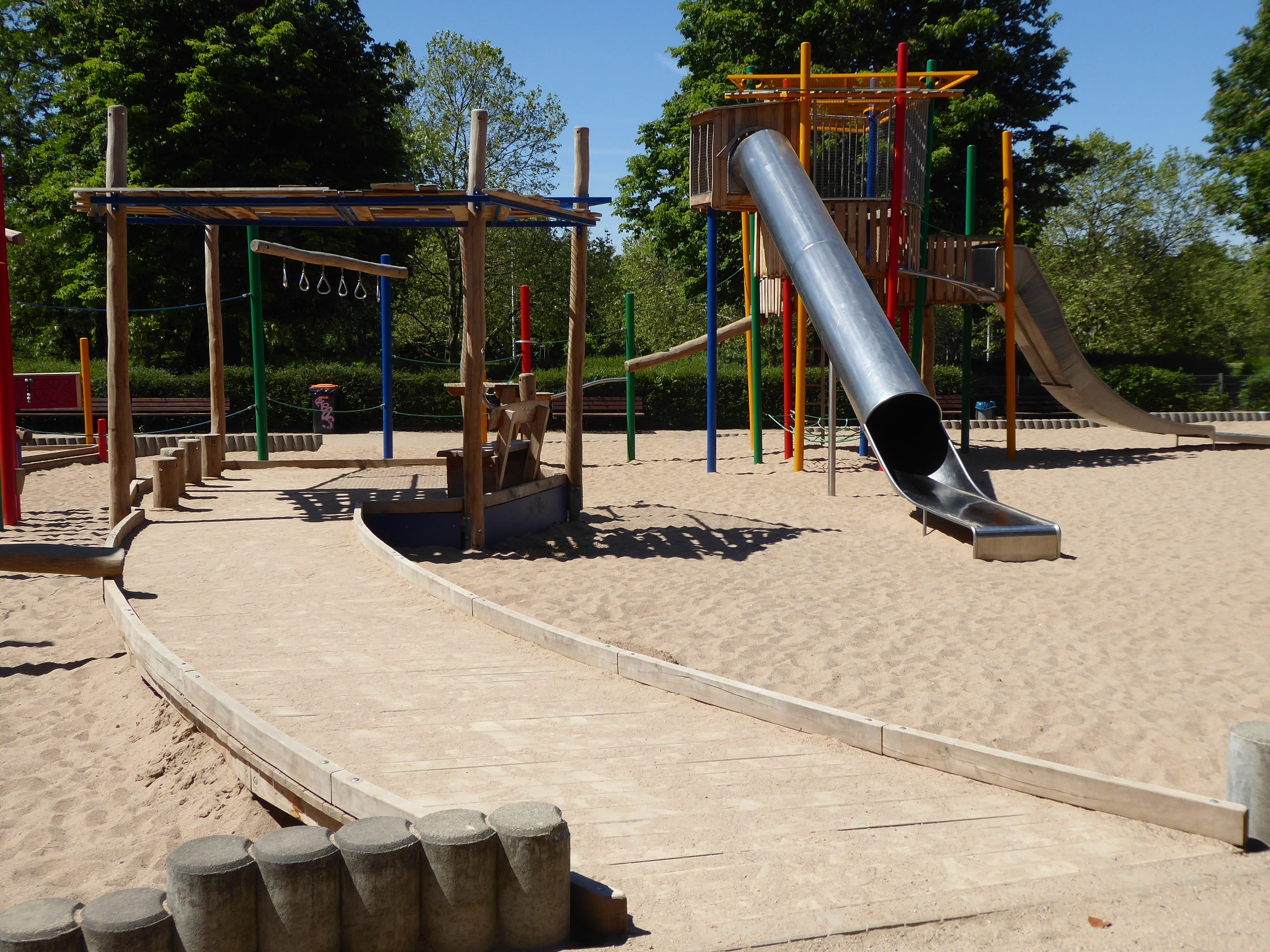 Hier ist wirklich für jedermann was dabei! Der große Spielplatz verfügt über eine hohe Anzahl von Kletter- und Balanciermöglichkeiten, Sandspielelementen, Plätze zum Ausruhen und Verweilen sowie verschiedene Rutschen. Die Themen Inklusion und Barrierefreiheit spielen ebenfalls eine große Rolle und schaffen so einen Raum zum gemeinsamen Spielen. Eine gute Einsehbarkeit, bunte Farben, die gute Laune schaffen und eine Materialkombination aus Robinienholz und Stahl zeichnen diesen Spielplatz aus.
