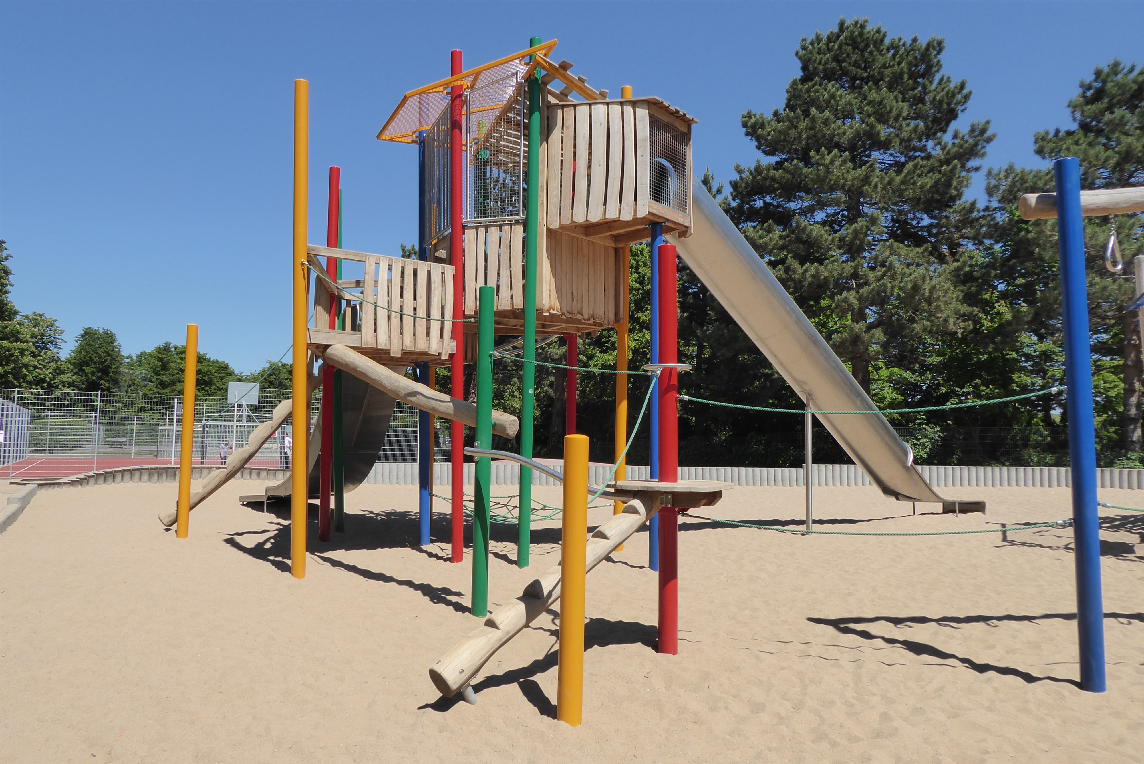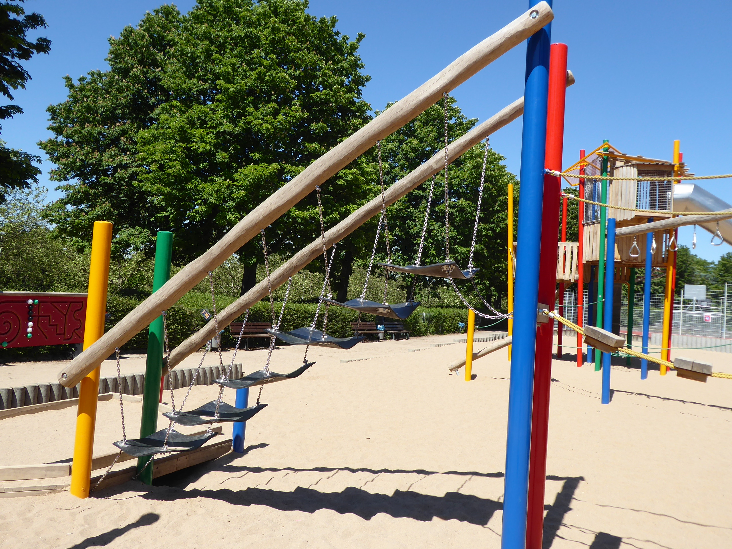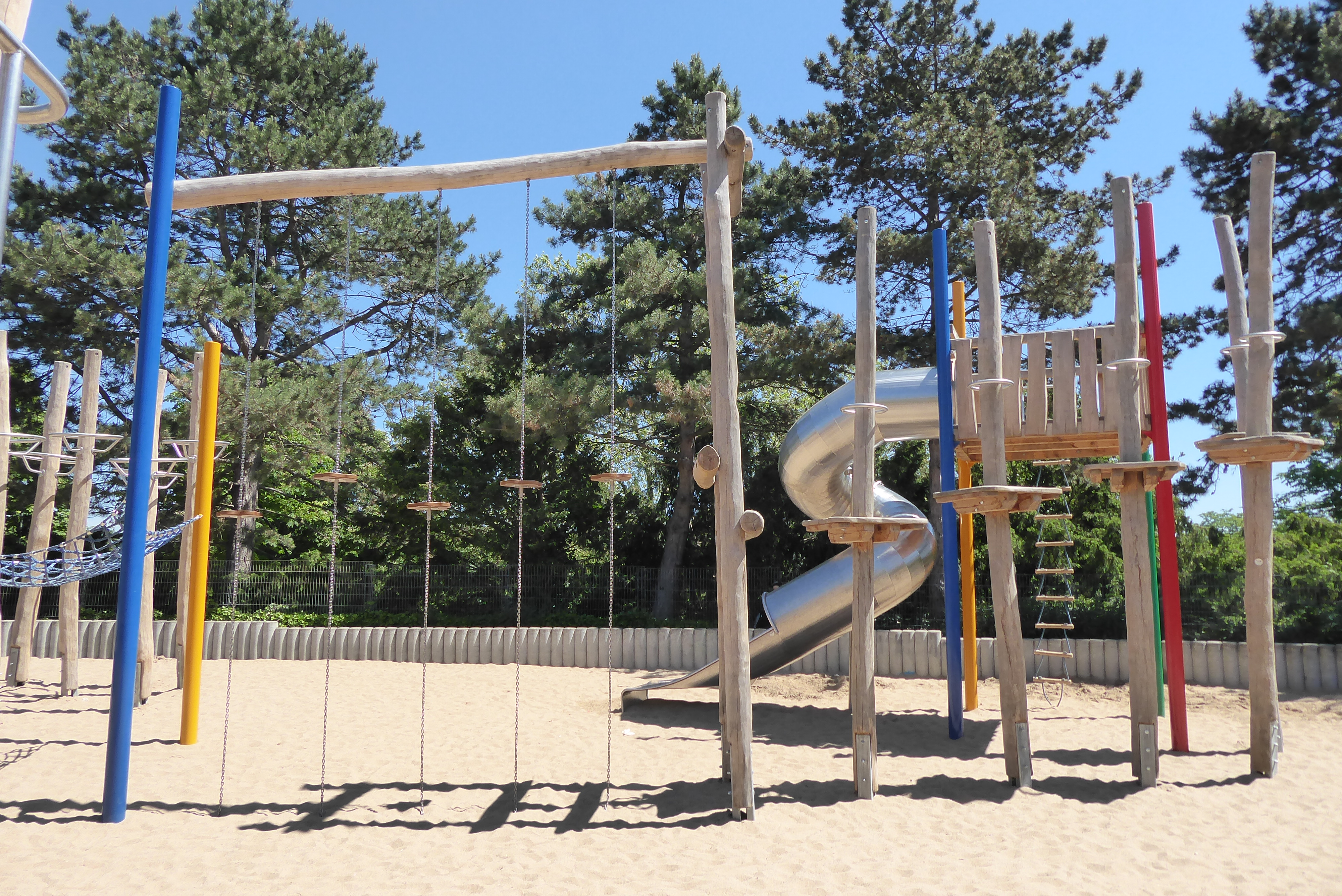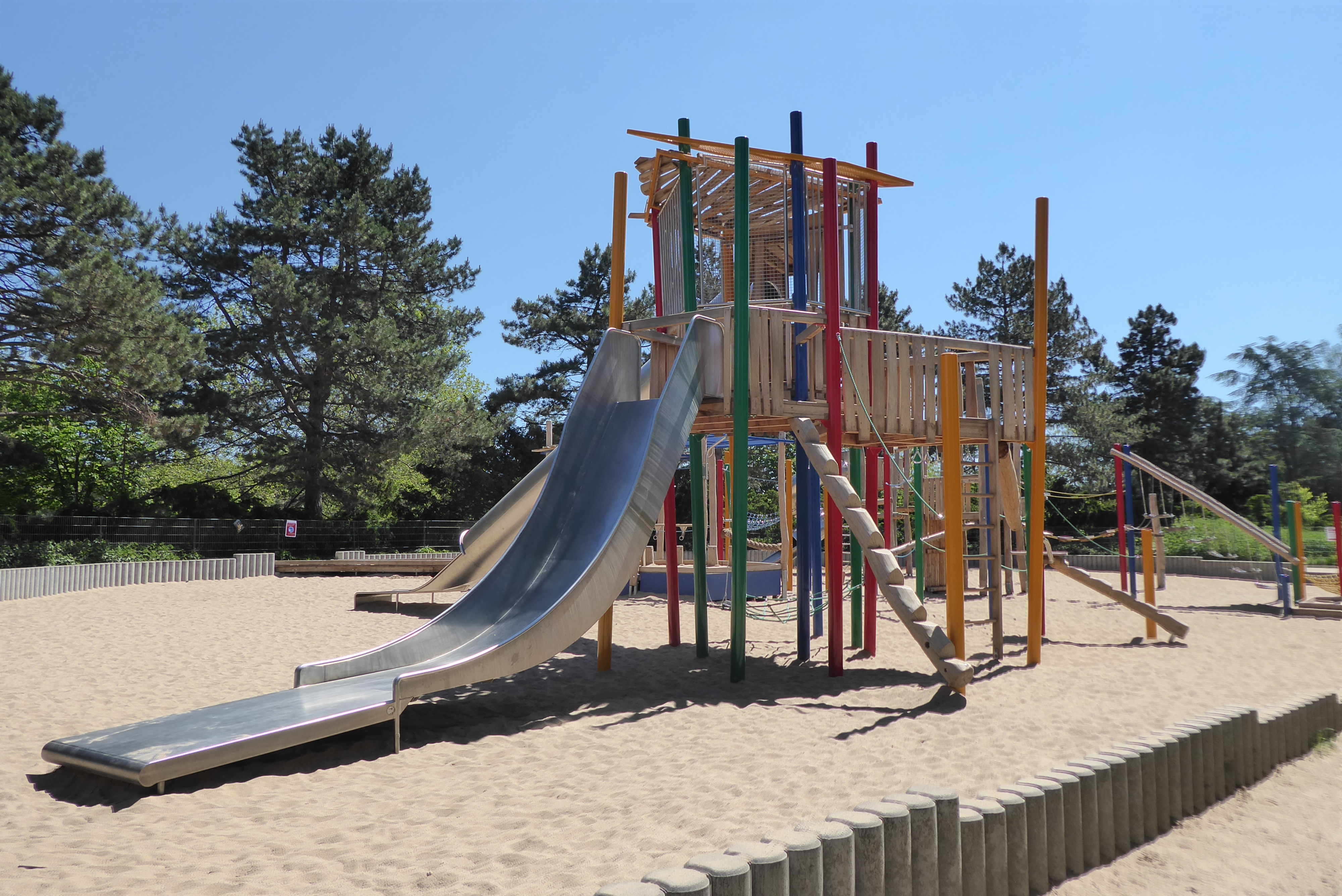 Hier ist wirklich für jedermann was dabei! Der große Spielplatz verfügt über eine hohe Anzahl von Kletter- und Balanciermöglichkeiten, Sandspielelementen, Plätze zum Ausruhen und Verweilen sowie verschiedene Rutschen. Die Themen Inklusion und Barrierefreiheit spielen ebenfalls eine große Rolle und schaffen so einen Raum zum gemeinsamen Spielen. Eine gute Einsehbarkeit, bunte Farben, die gute Laune schaffen und eine Materialkombination aus Robinienholz und Stahl zeichnen diesen Spielplatz aus.