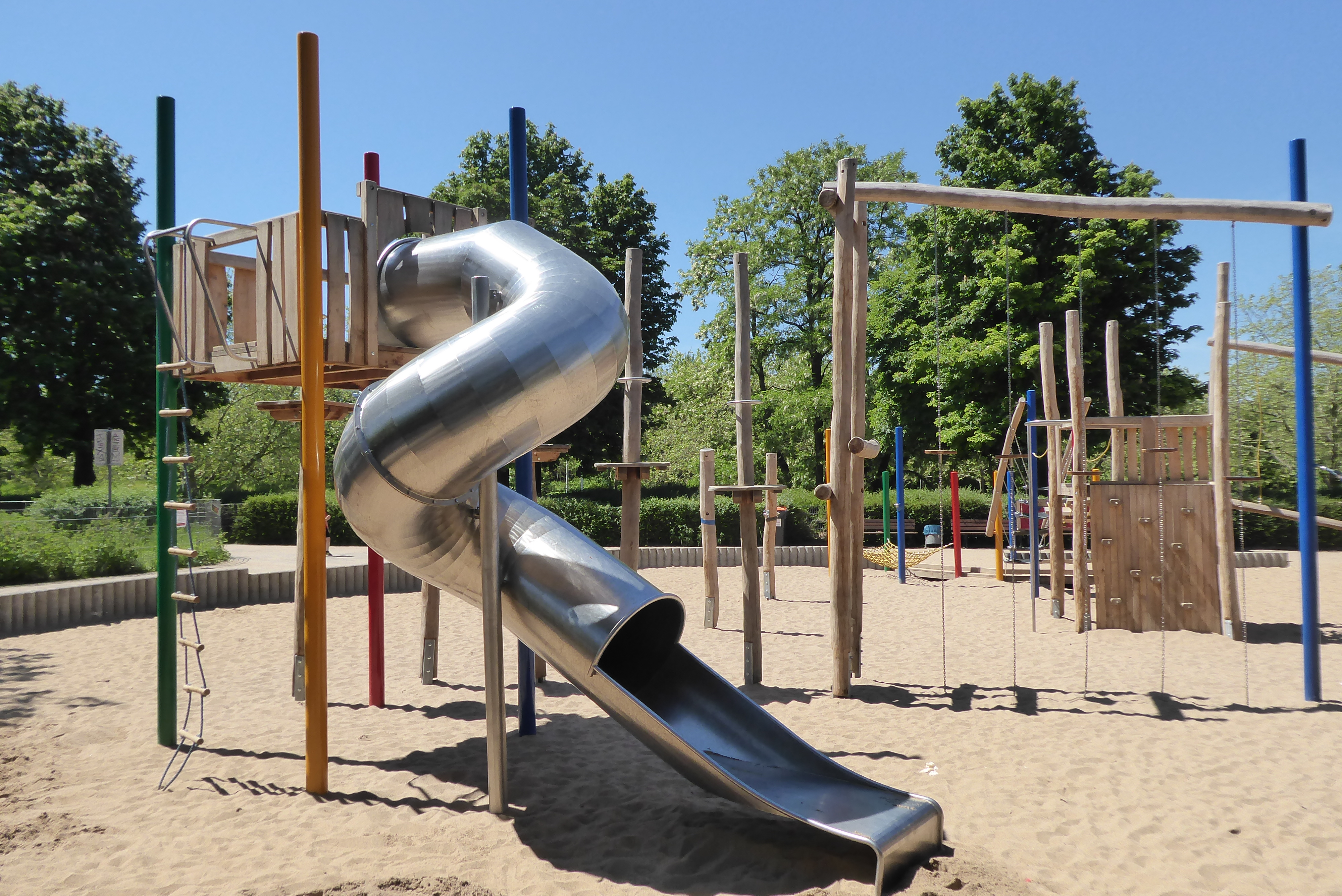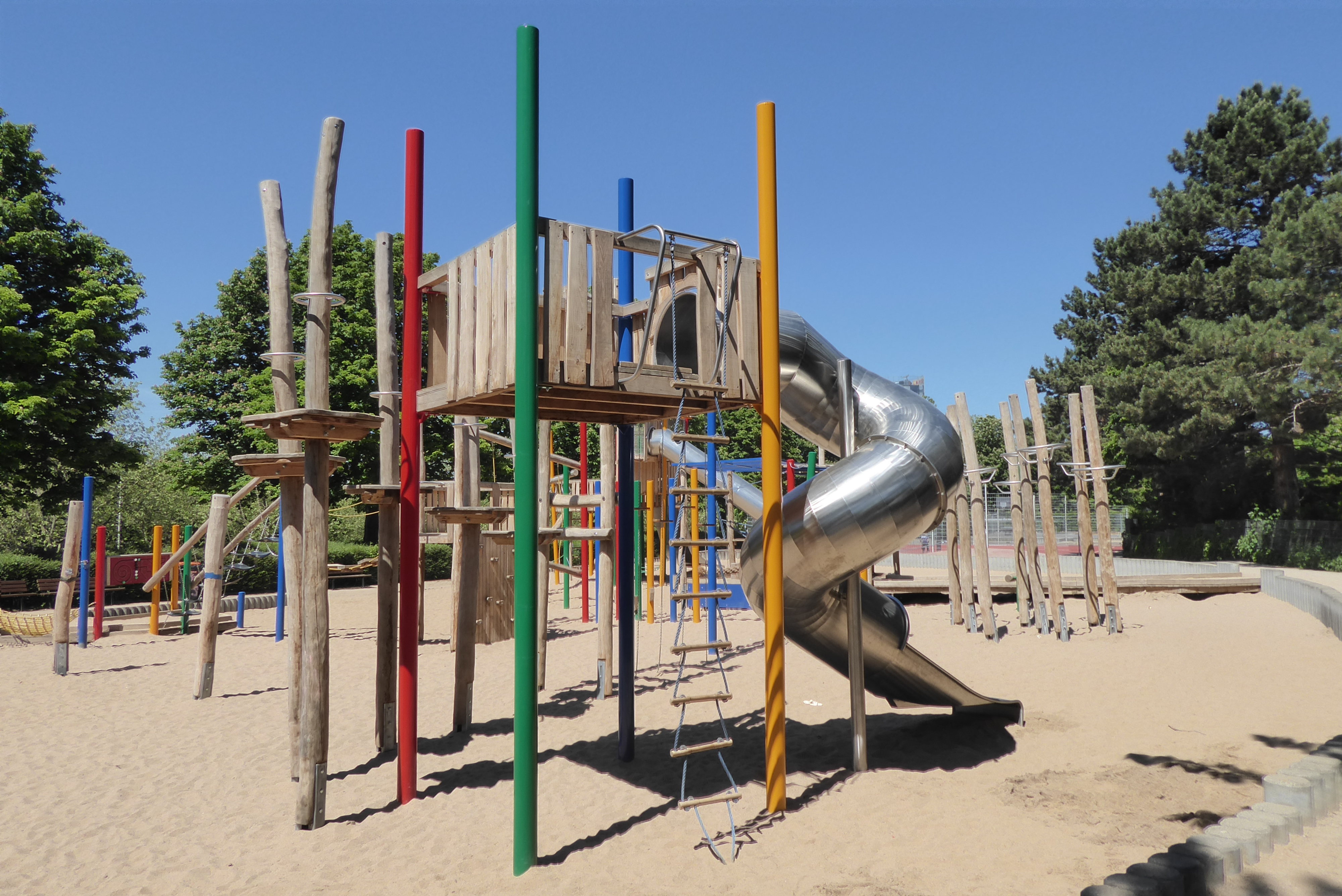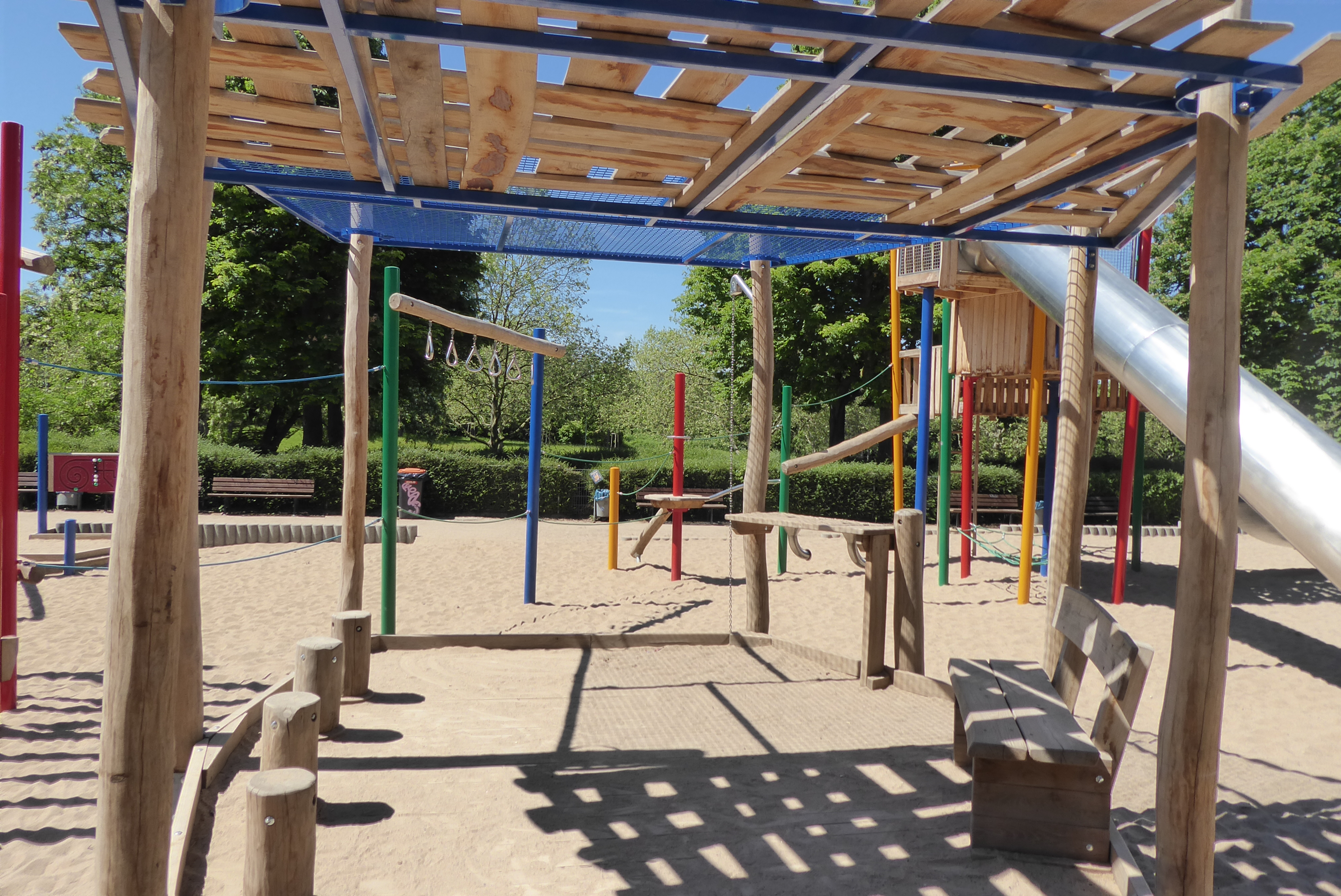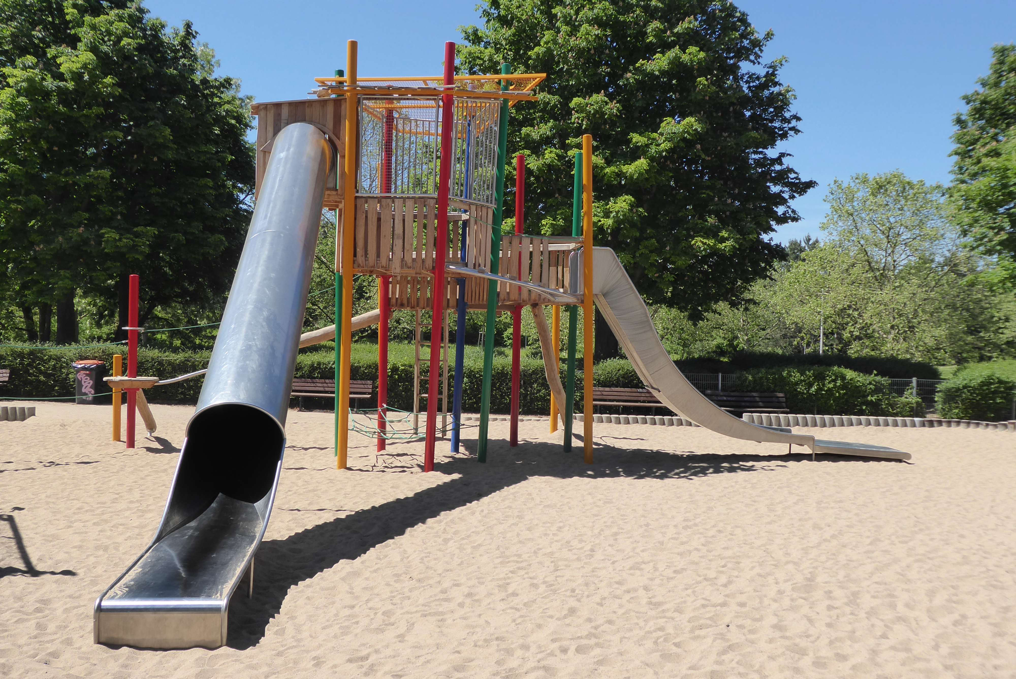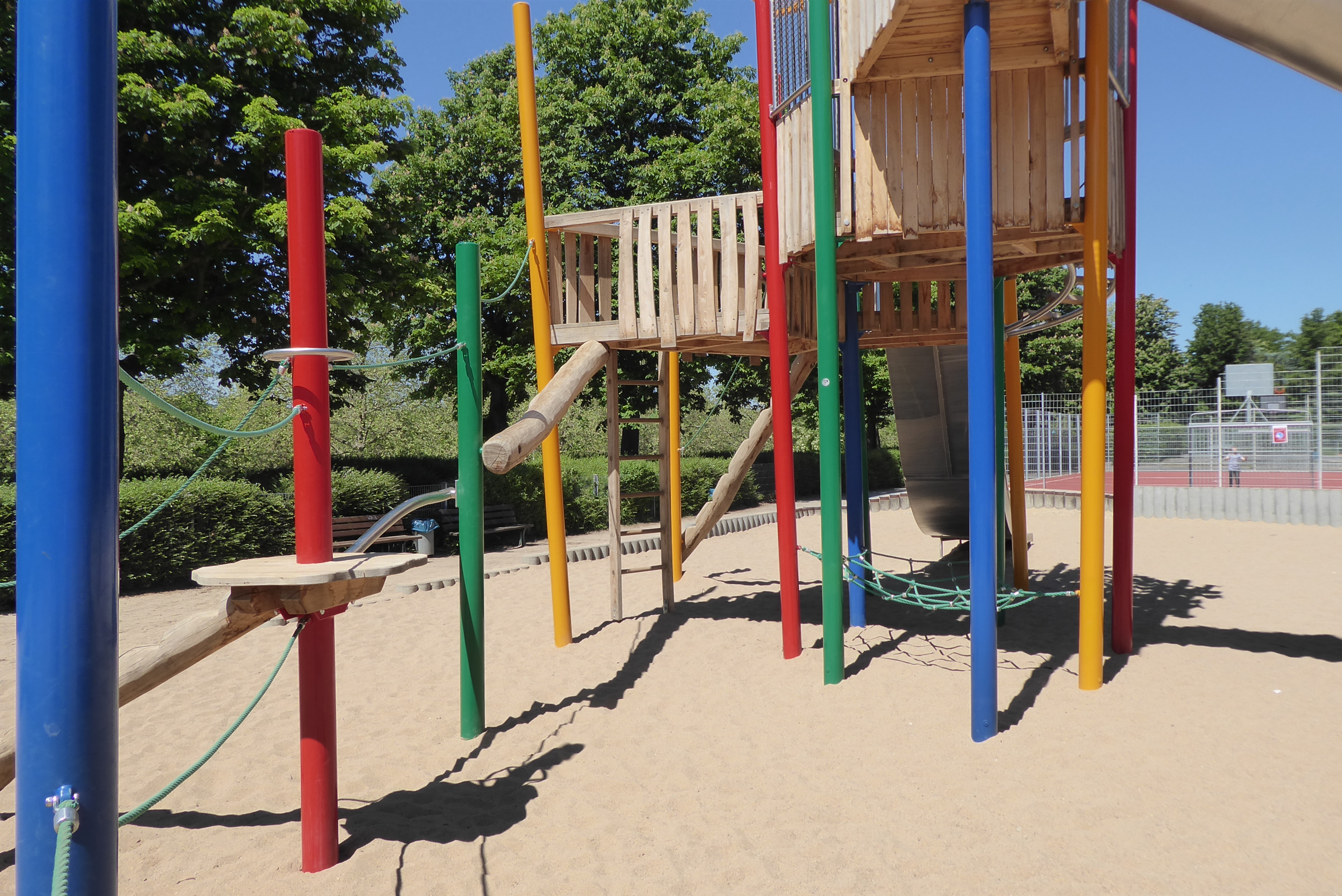 Hier ist wirklich für jedermann was dabei! Der große Spielplatz verfügt über eine hohe Anzahl von Kletter- und Balanciermöglichkeiten, Sandspielelementen, Plätze zum Ausruhen und Verweilen sowie verschiedene Rutschen. Die Themen Inklusion und Barrierefreiheit spielen ebenfalls eine große Rolle und schaffen so einen Raum zum gemeinsamen Spielen. Eine gute Einsehbarkeit, bunte Farben, die gute Laune schaffen und eine Materialkombination aus Robinienholz und Stahl zeichnen diesen Spielplatz aus.