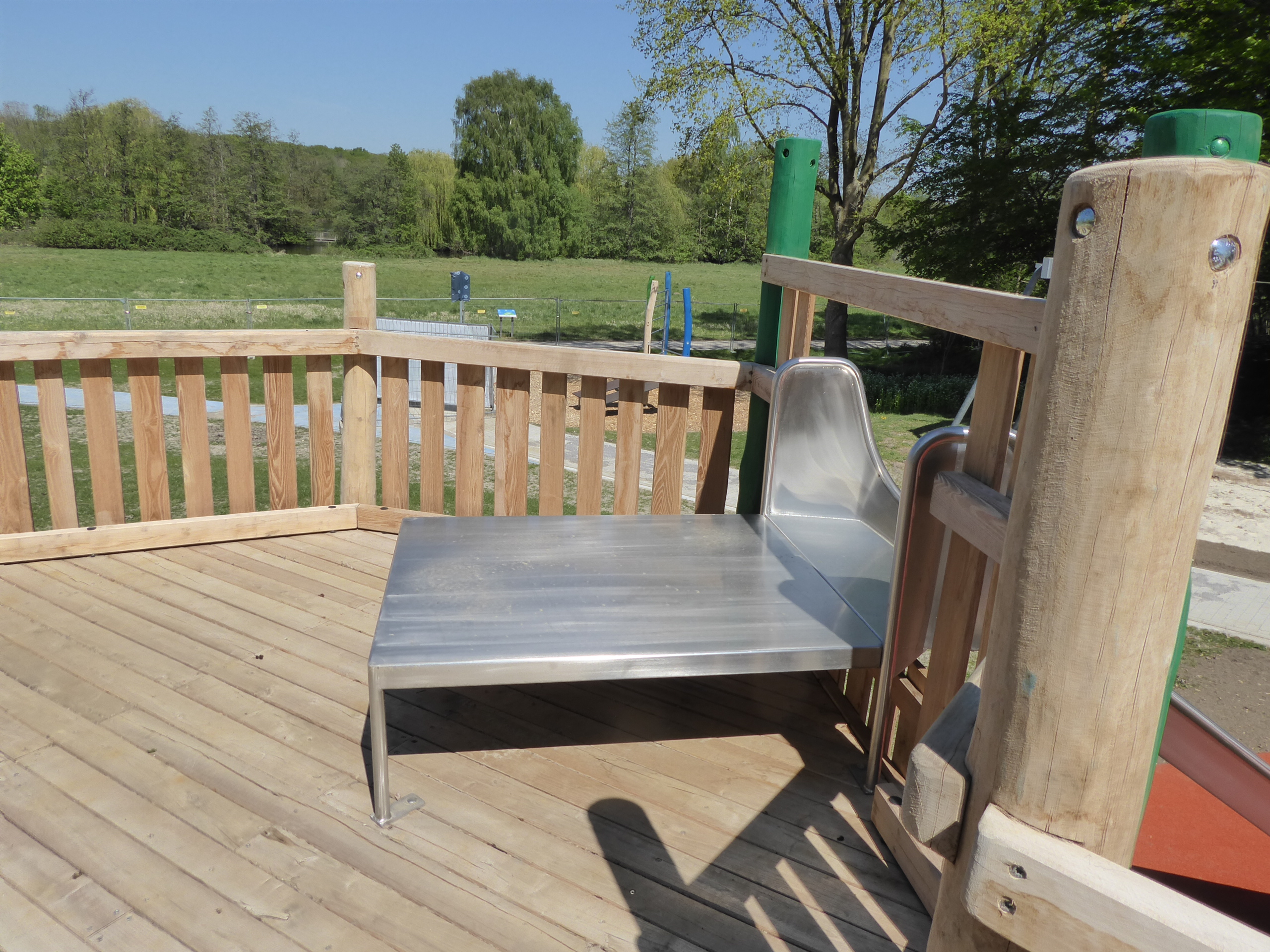 Die Anlage ist beispielsweise mit einer Rollstuhltreppe versehen, die auch Menschen mit Beeinträchtigung das Mitspielen möglich macht. Auf dem Boden sind Edelstahlhindernisse und Gitterböden eingebracht worden, die einen zusätzlichen Anreiz bieten und ein abwechslungsreiches Spiel möglich machen.