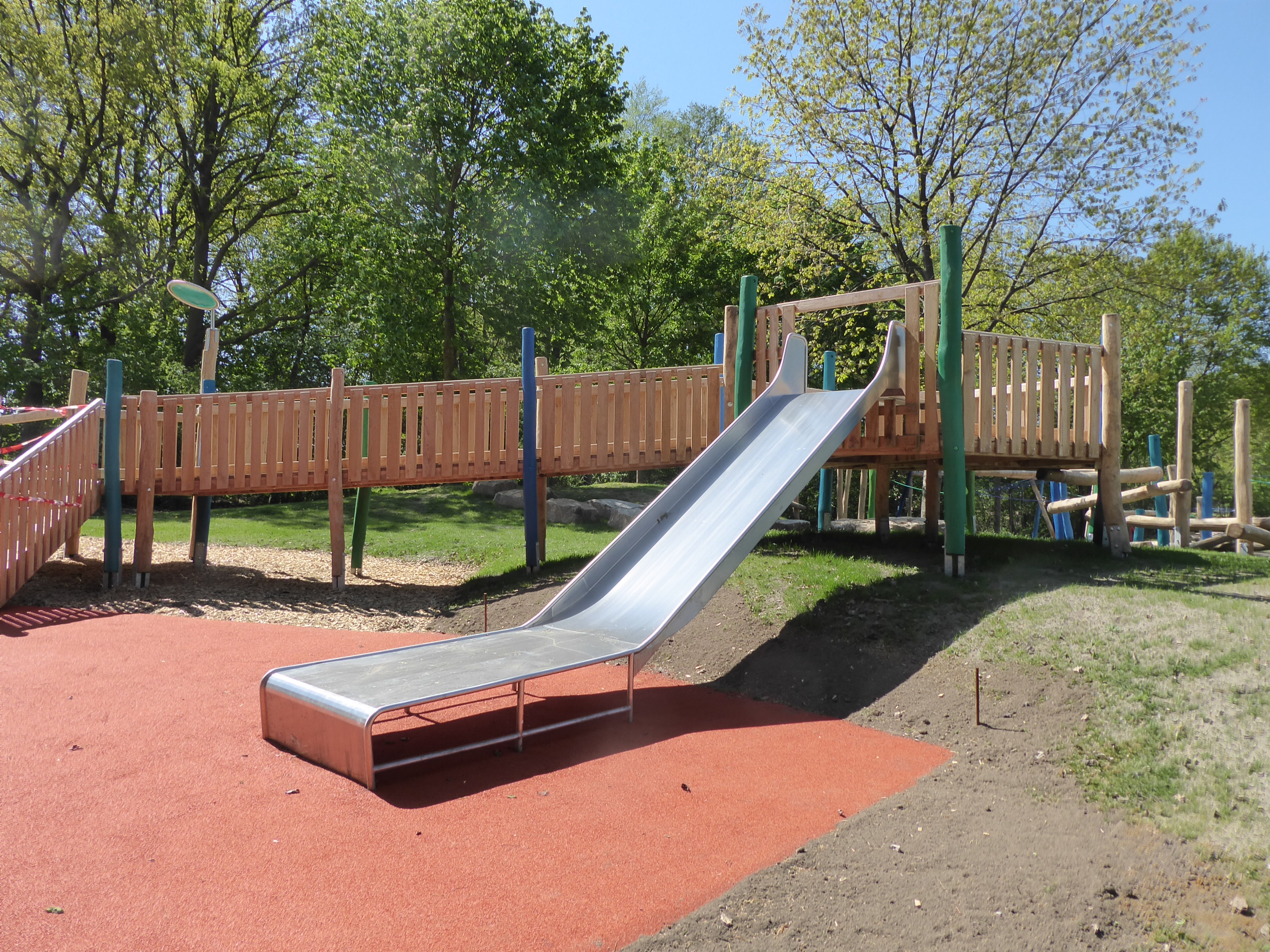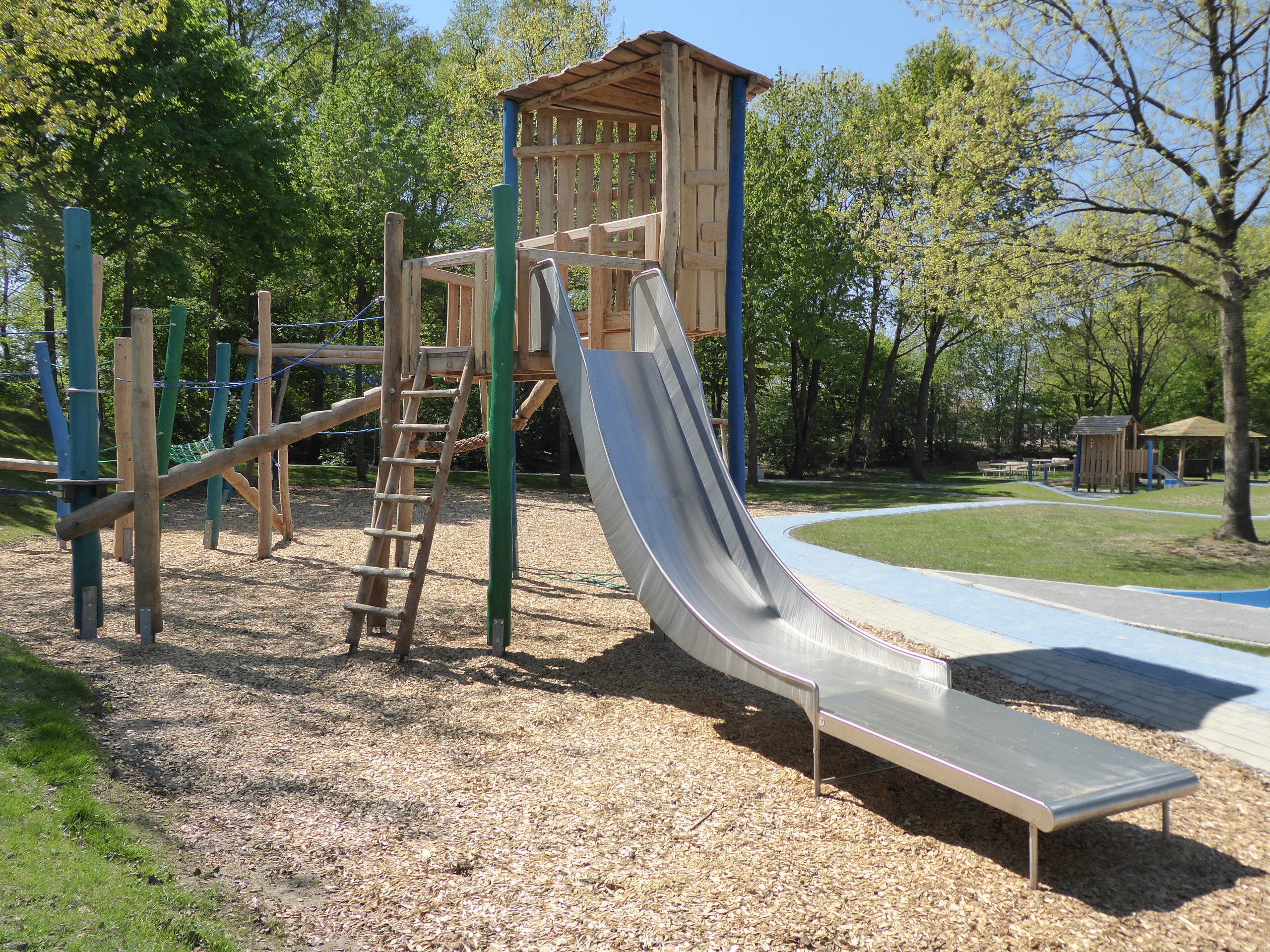 Über das Balanciermikado und div. weitere Kletter- und Balanciermöglichkeiten gelangen die Kinder zu dem großen Rutschenturm, den sie über diverse aufregende Freifallrutsche wieder hinuntersausen können.