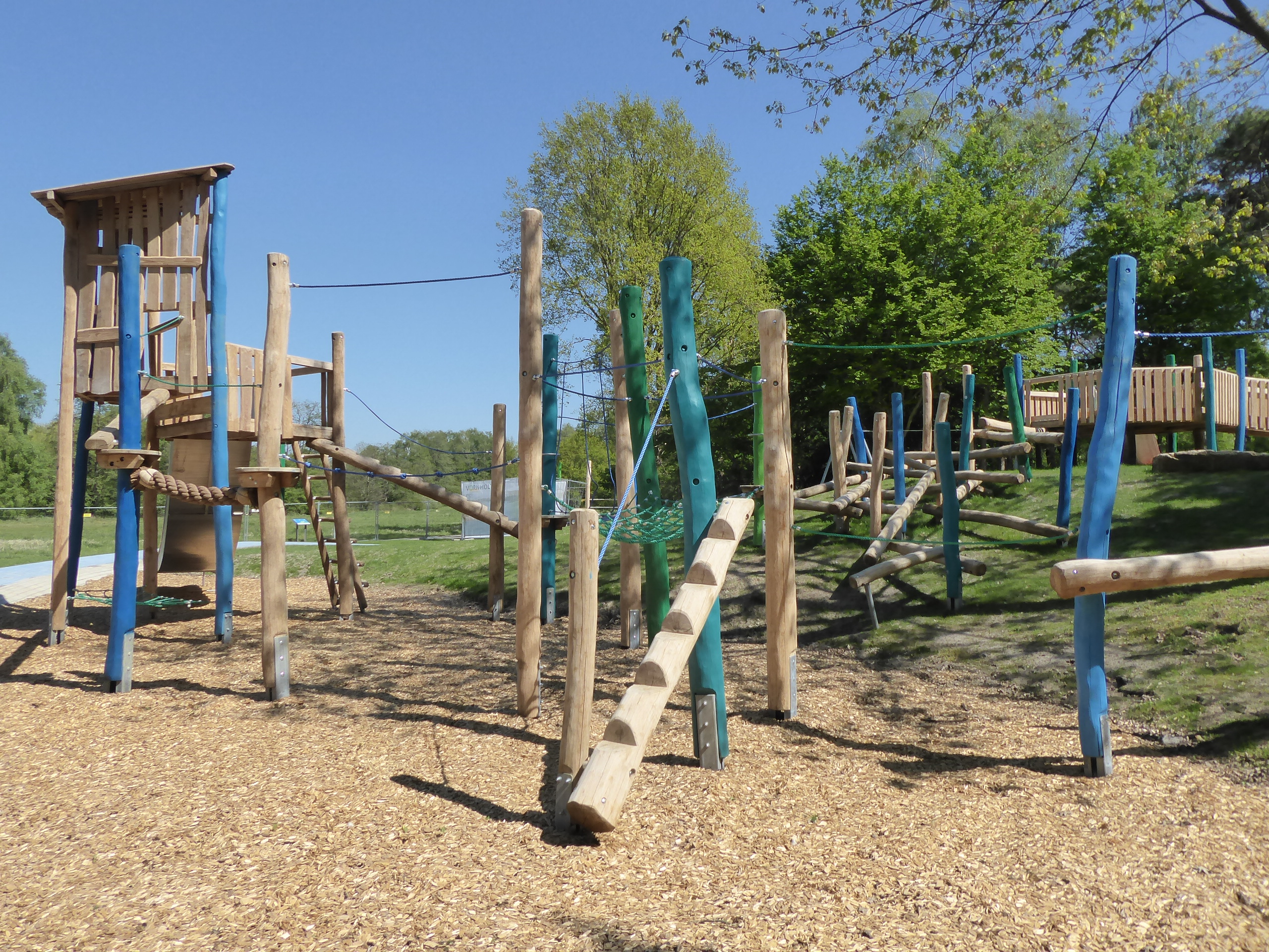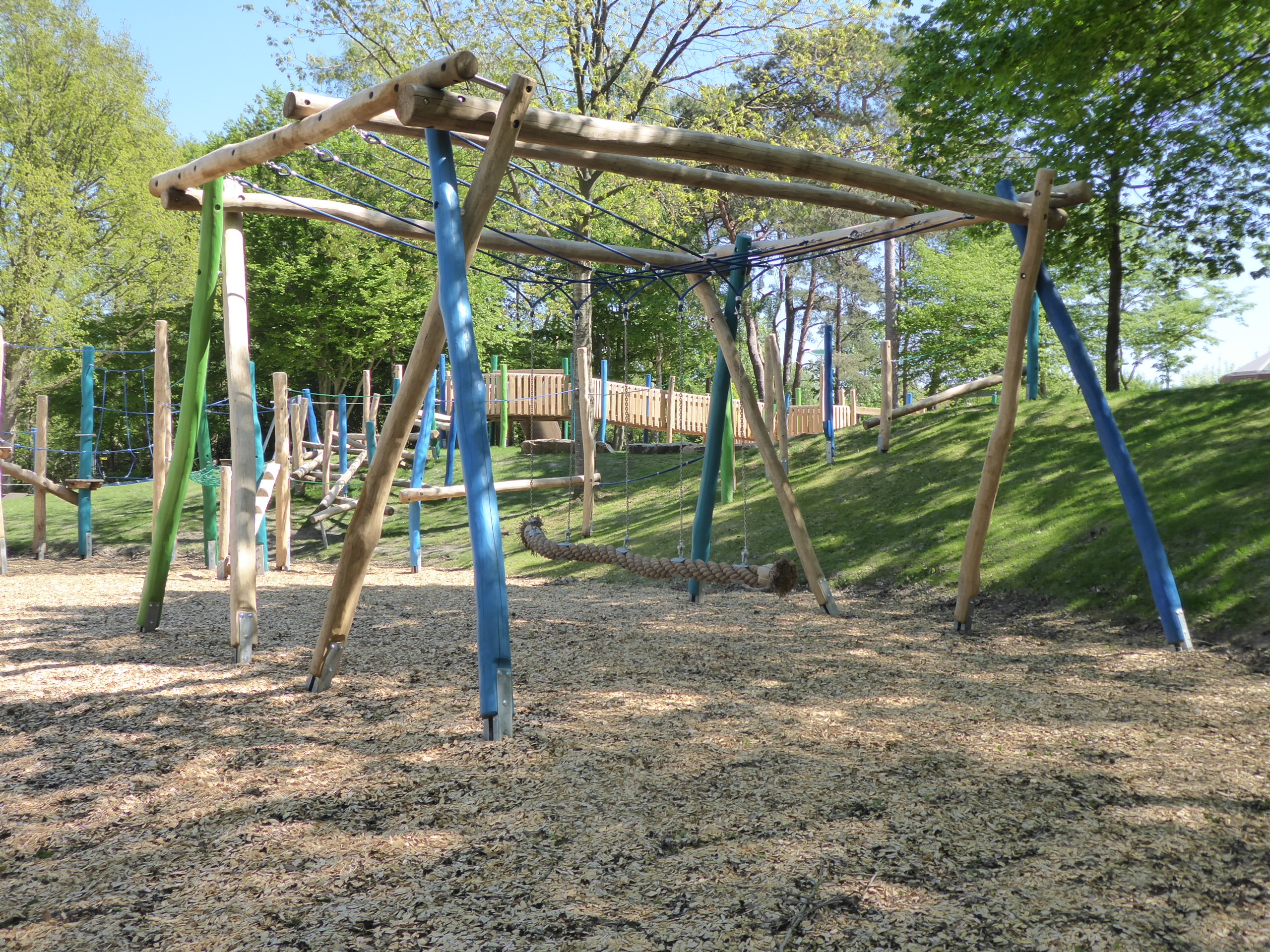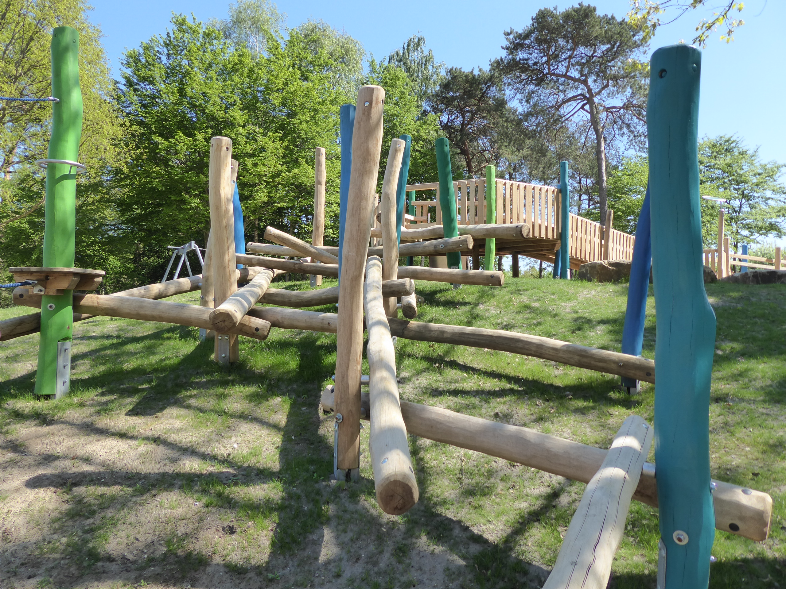 Die große Spielkombination mit Balancieranlage fällt den Besuchern gleich beim Betreten des Spielplatzes ins Auge und die Platzierung im Bereich "Rauf und Runter" ist mehr als zutreffend.