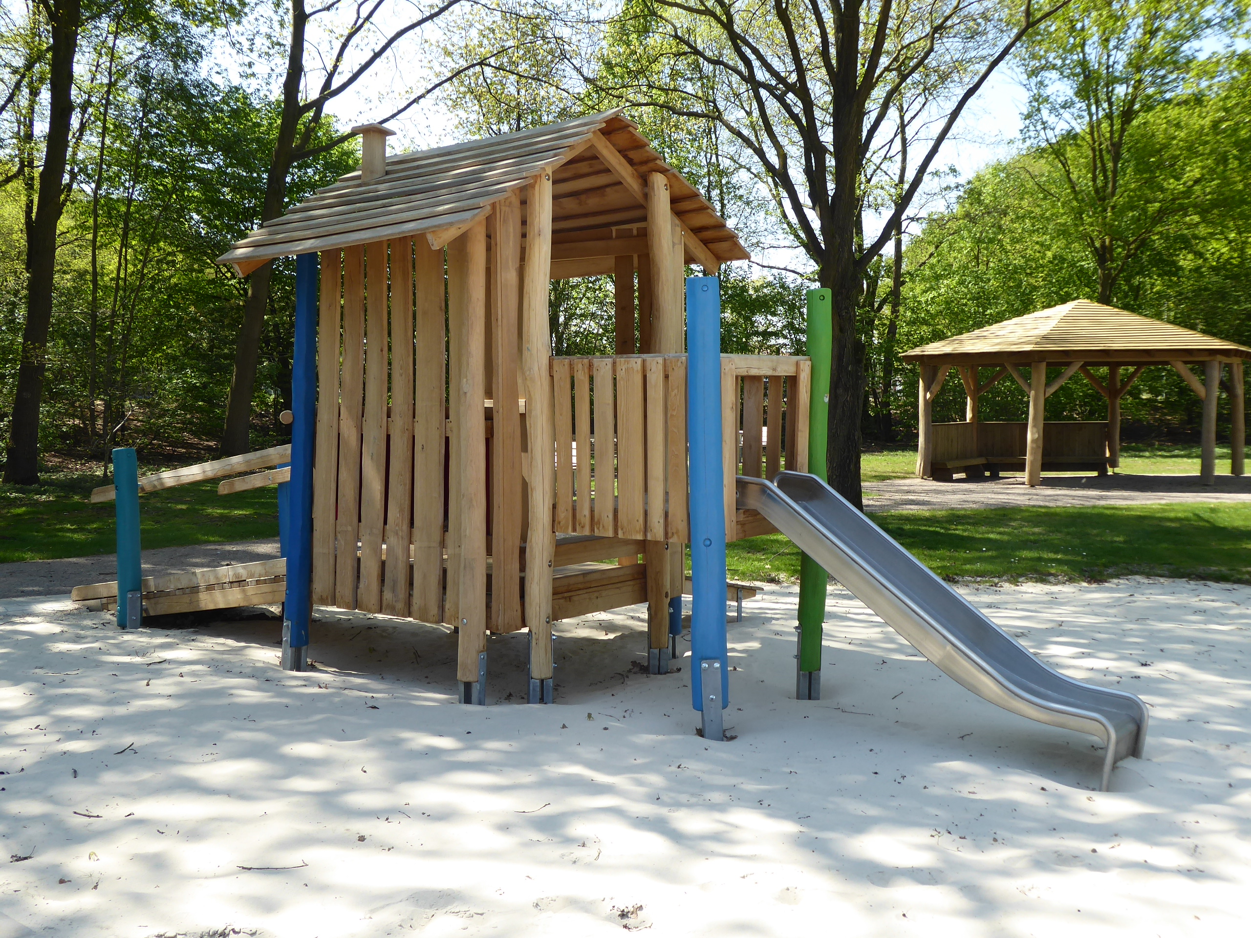 Mit einer Sandbaustelle, der Torschaukel mit einem Schaukelsitz "Groß- und Klein" sowie einer Spielhäuschenkombination ist für jeden etwas dabei.