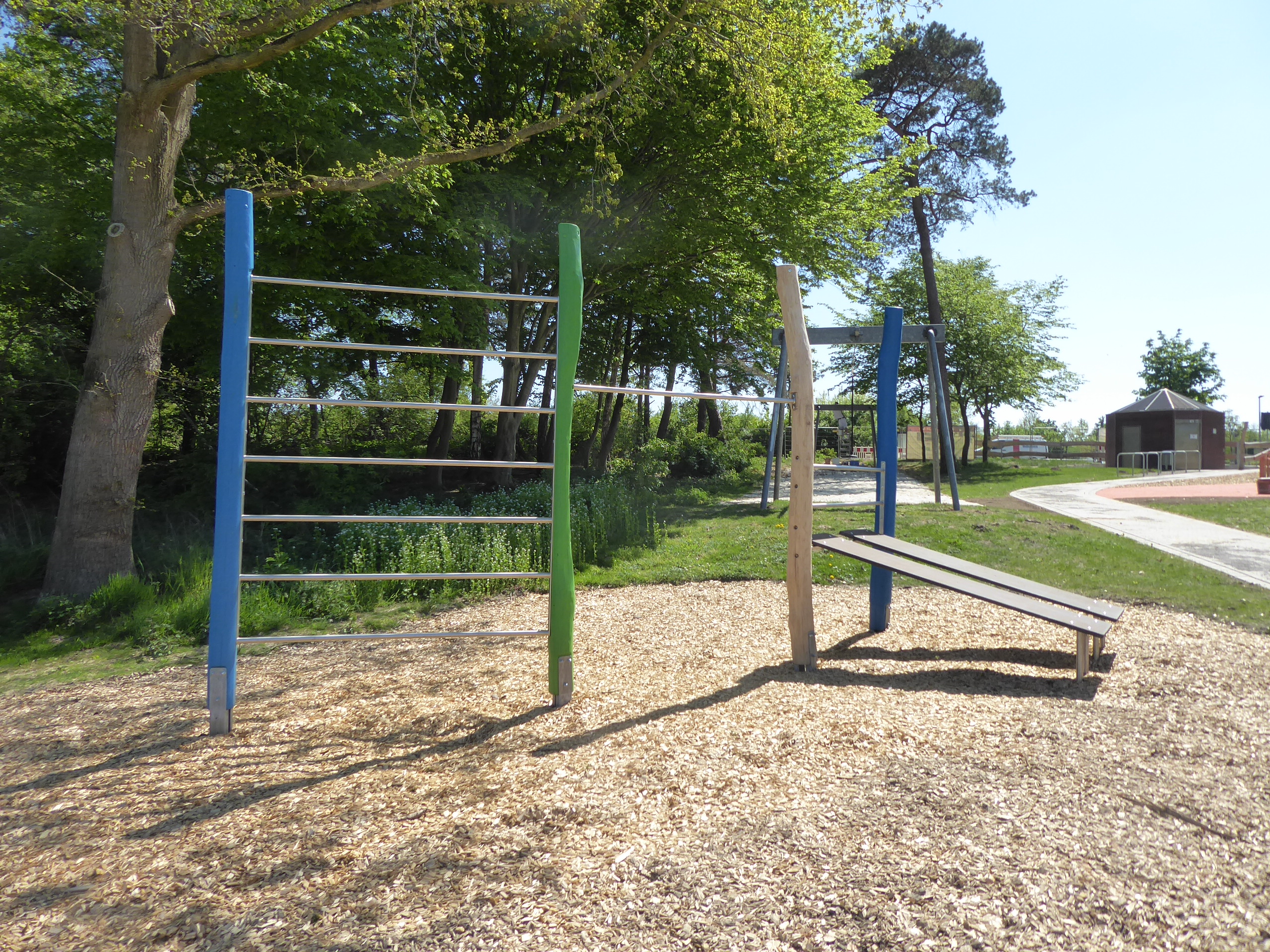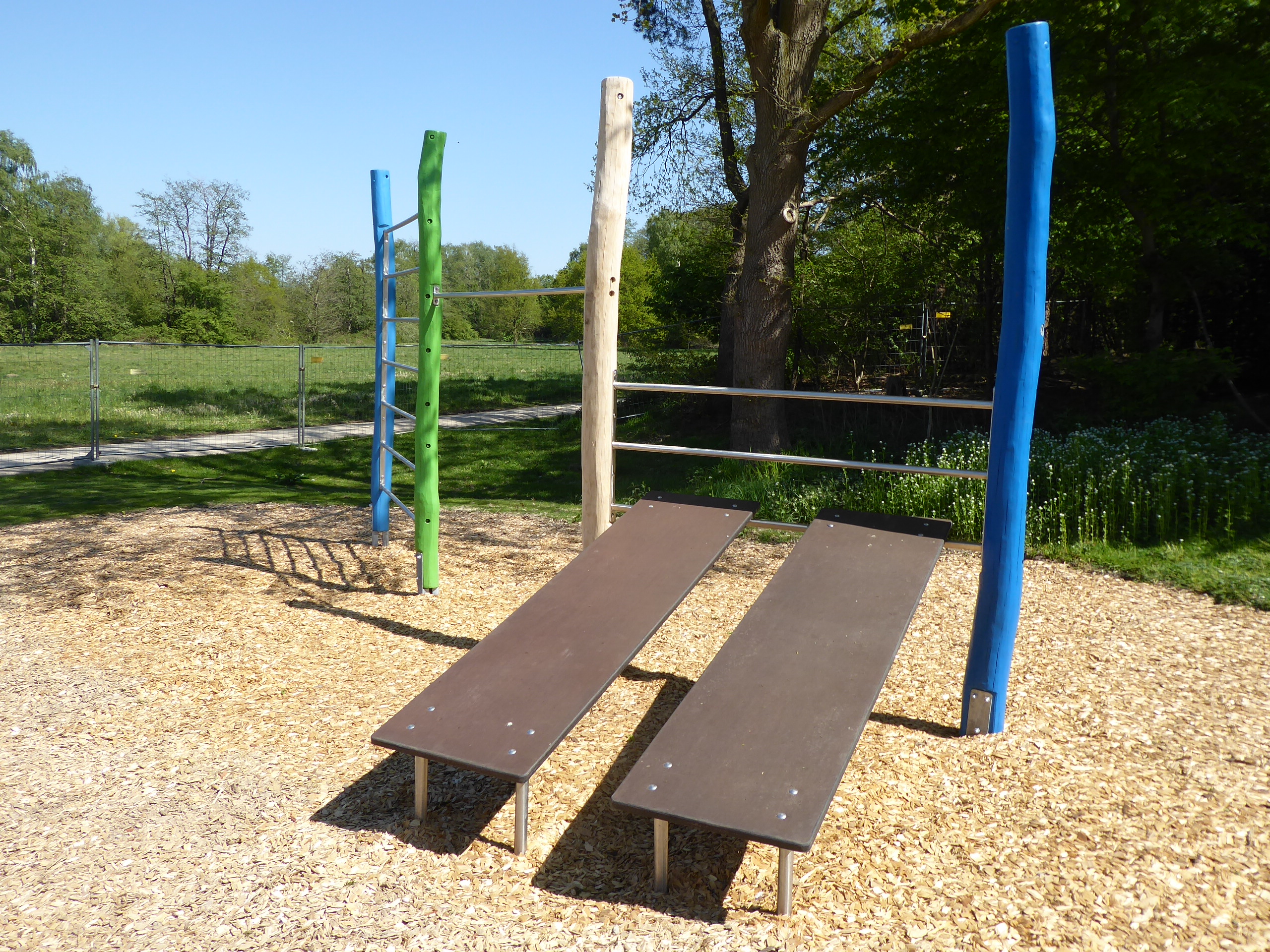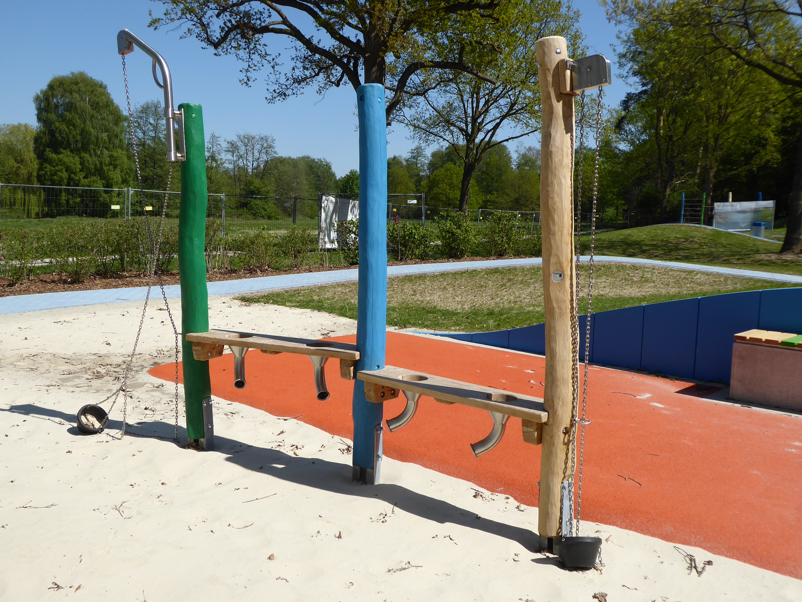 Der Bereich "Rauf und Runter" ist mit zwei Schaukeln ausgestattet worden, die sich direkt neben dem Fitnessberech befinden, an der sich die Spielplatzbesucher an der Fitnesswand versuchen können.