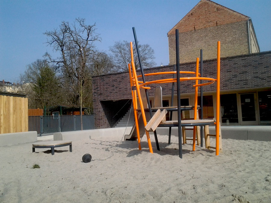 Spielen und Bildung - das passt zusammen: An an der Bürgerbildungsstätte mit Kita in Eberswalde wurde ein neuer Spielplatz für die Kleinen errichtet. Er besteht aus einem zentralen Element, was Kletterspaß und Rutschvergnügen vereint. Umgeben von weichem Sand lässt sich hier perfekt toben und spielen. Weitere einzelne Spielgeräte und auch eine große Schaukel sind über das Gelände verteilt und bieten viel Platz für Fantasie und kreatives Spielen.