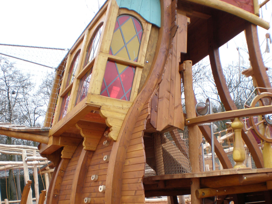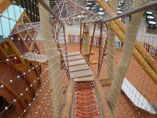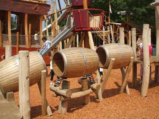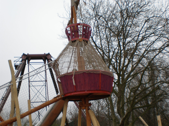 Oder man erstürmt einen zweiten kleineren Mast, ebenfalls mit rundem Ausguck, der Anbindungen zum weiteren Erobern der Spiellandschaft über Kletter- und Balancierelemente besitzt. Neben bekannten Geräten entstanden Neuheiten wie die Fässerbrücke auf Federn.