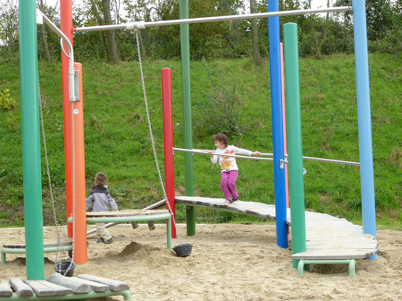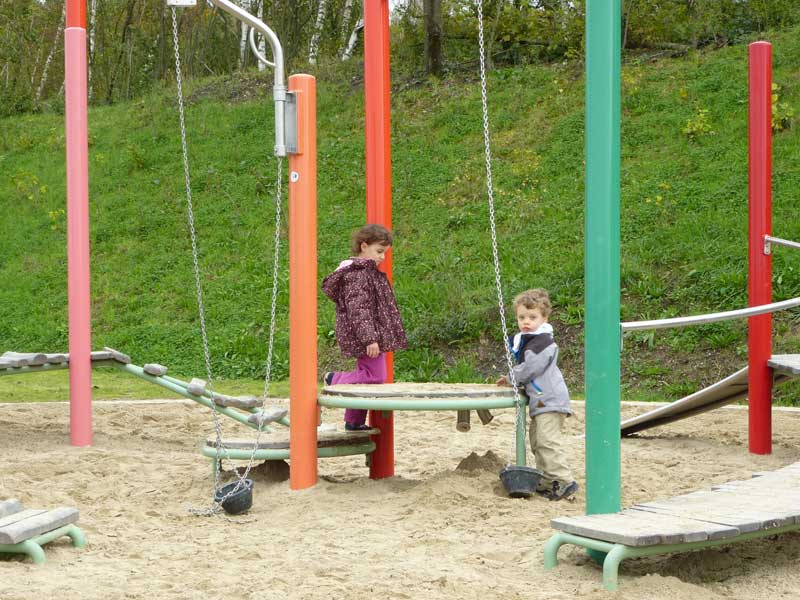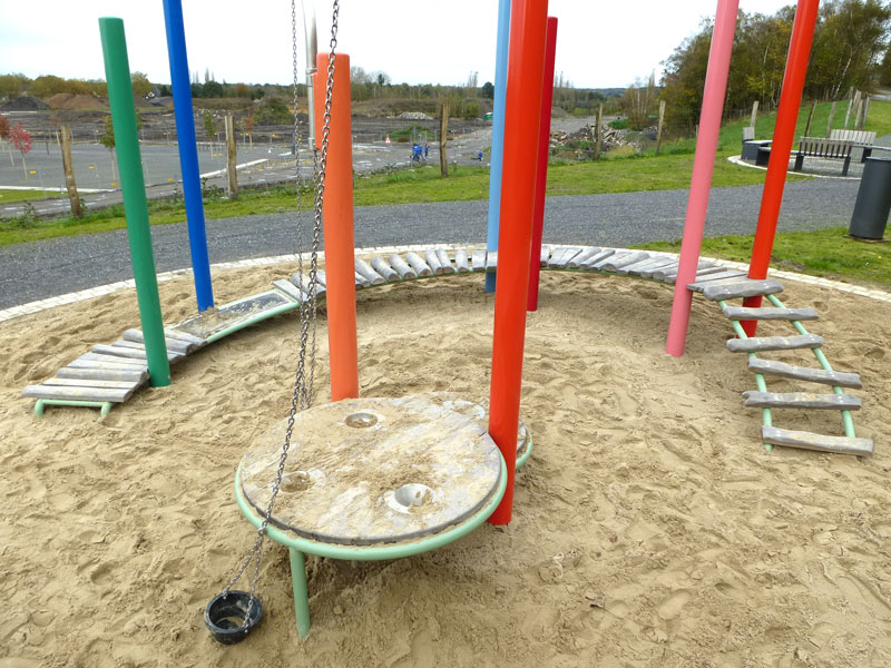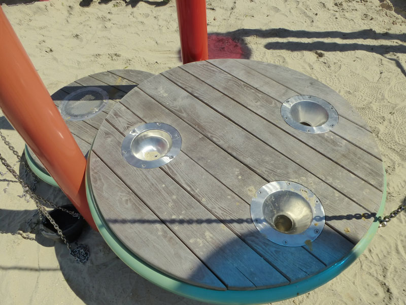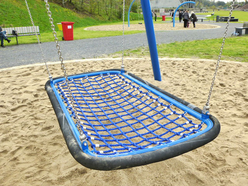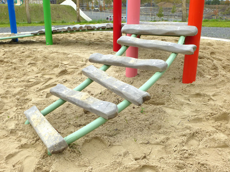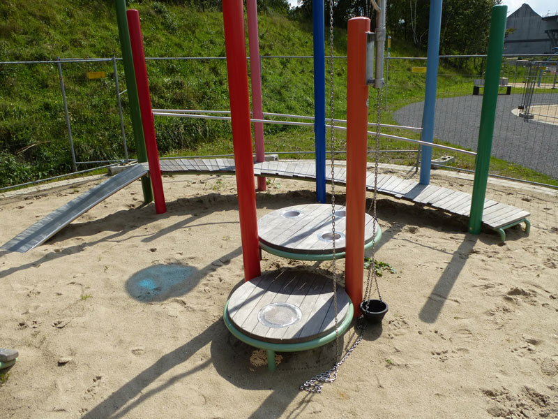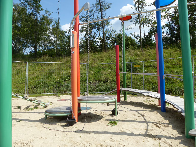 Wer danach schnell wieder die Erde unter den Füßen spüren will und Lust auf Nervenkitzel hat, nimmt einfach die rasante Freifallrutsche nach unten. Dort warten dann noch ein großer Sandbereich mit schwenkbaren Eimern und vielen weiteren Spielmöglichkeiten sowie Schaukeln.