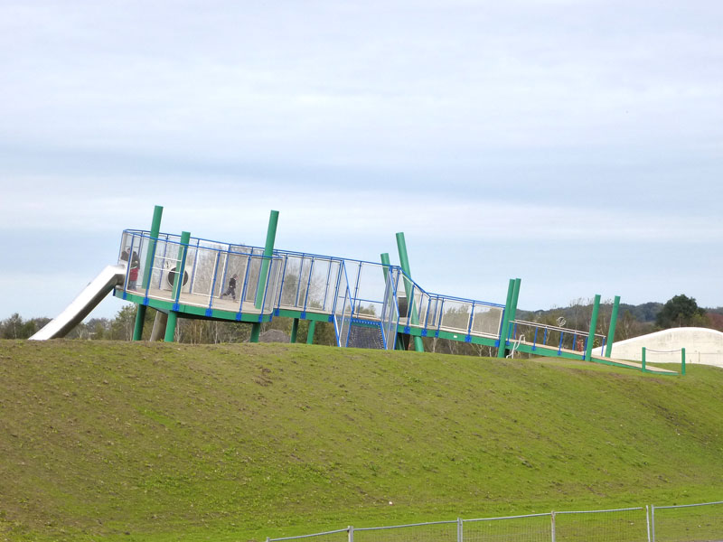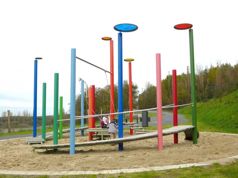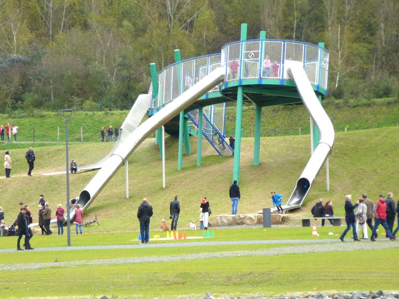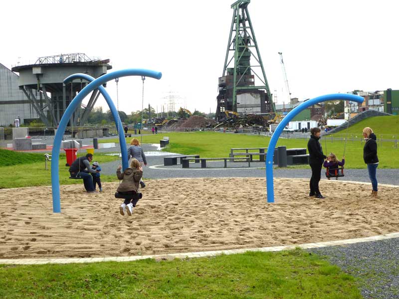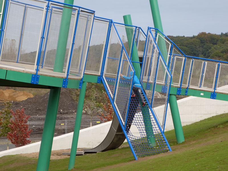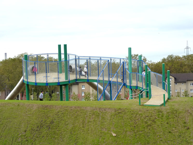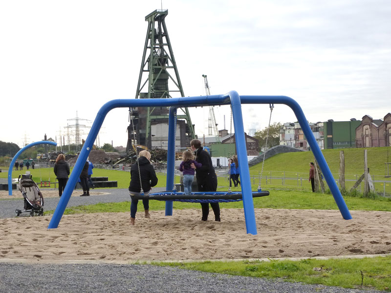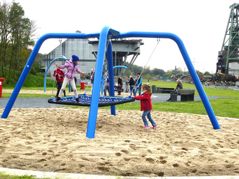 Ganz schön futuristisch ist die Spielanlage an der Zeche Lohberg in Dinslaken. Im Fokus steht der Skywalk auf dem Groß und Klein - wie der Name bereits verrät - fast in den Himmel laufen können. Dabei ändert sich durch den schrägen Verlauf des Skywalks stets der Blickwinkel zum Horizont.