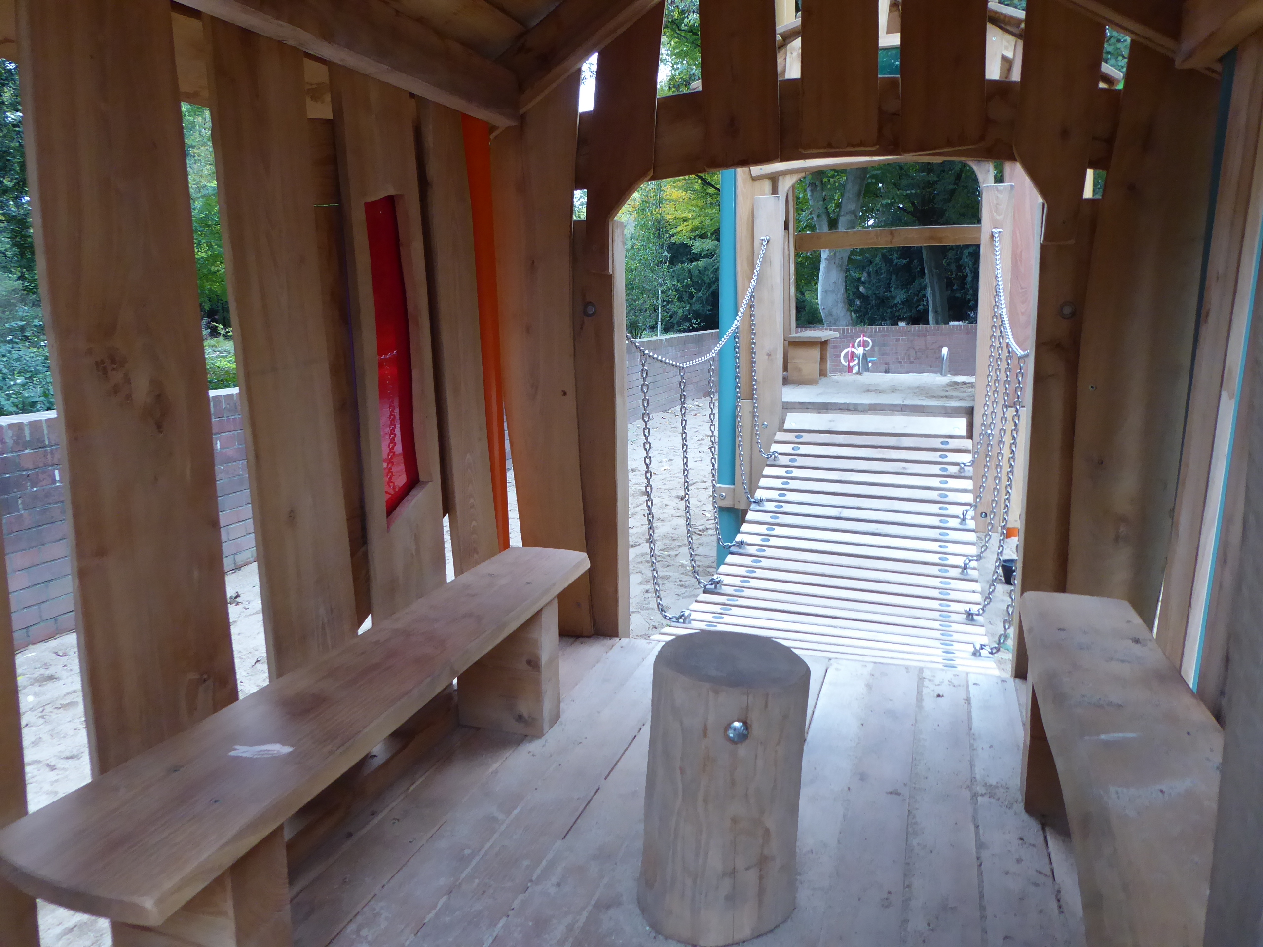 Weiter geht's zu den Spielhäuschen, die über eine Hängebrücke miteinander verbunden worden sind. Hier können die Kinder kurz verweilen oder sich mit den kleinen Sandspielelementen beschäftigen.