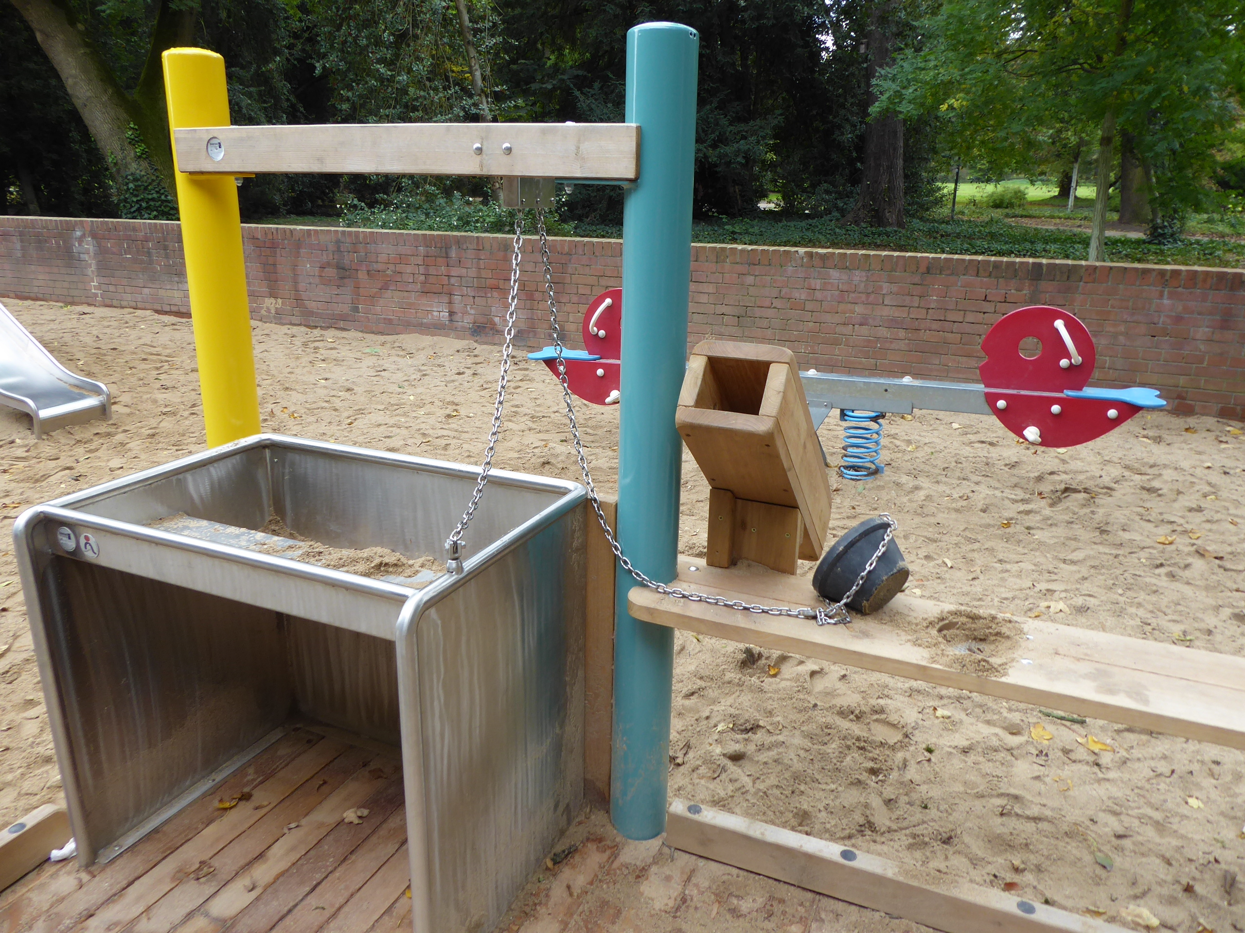 Einen größeren, barrierefreien Sandspielbereich mit angeschlossenem Wasserspielplatz gibt's natürlich auch. Hier kann jeder nach Herzenslust matschen und das Wasser über die Rinnen laufen lassen.