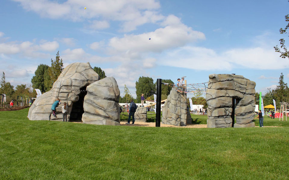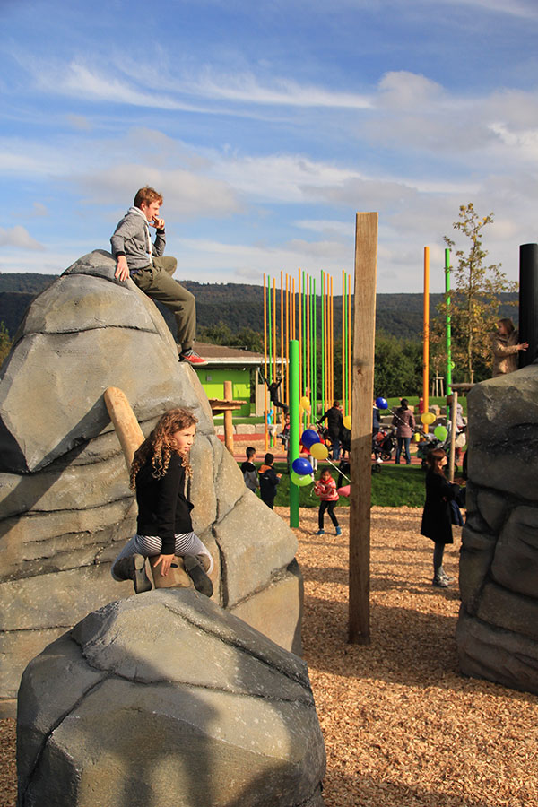 Ein Highlight ist der große Kletterfelsen mit Rutsche, der durch ein drei Meter hohes "Traumfängernetz aus Slacklingegurten" verbunden ist, auf