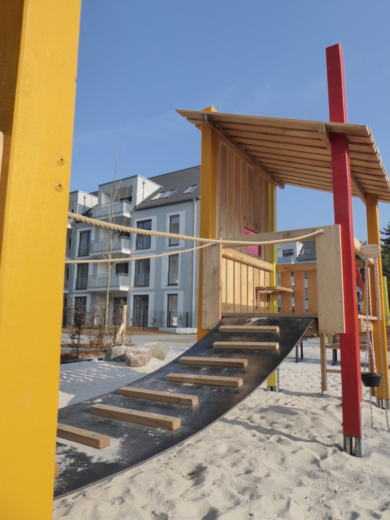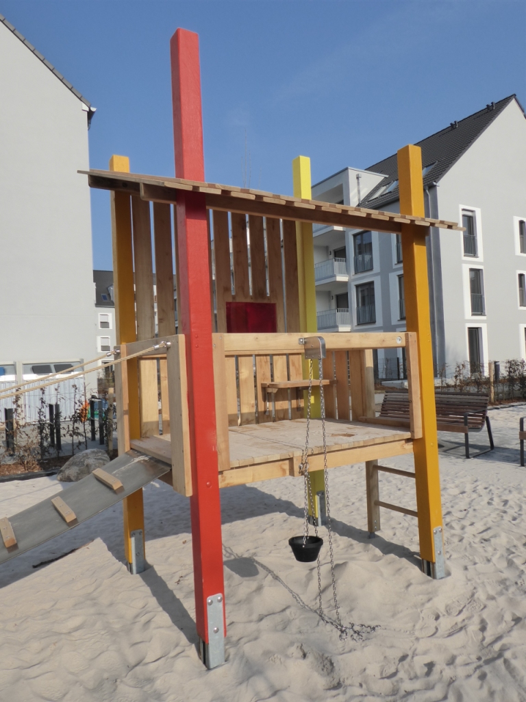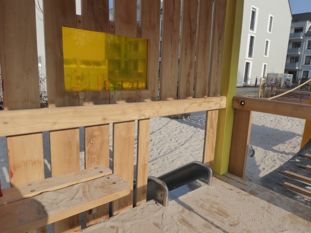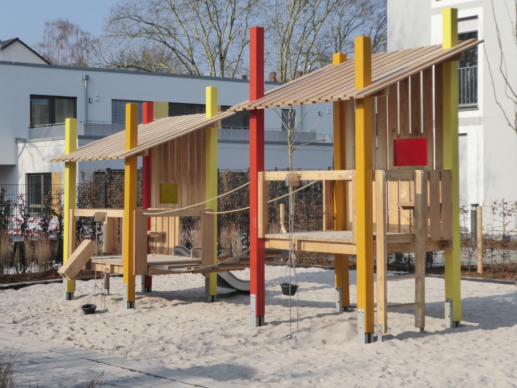 Ferner stehen zwei Spielhäuschen bereit, die zum Sandspiel und Rollenspiel auffordern. Die farbige und kantige Gestaltung setzt Akzente, die nicht nur Kinder, sondern bestimmt auch zufriedene Eltern anlocken wird.