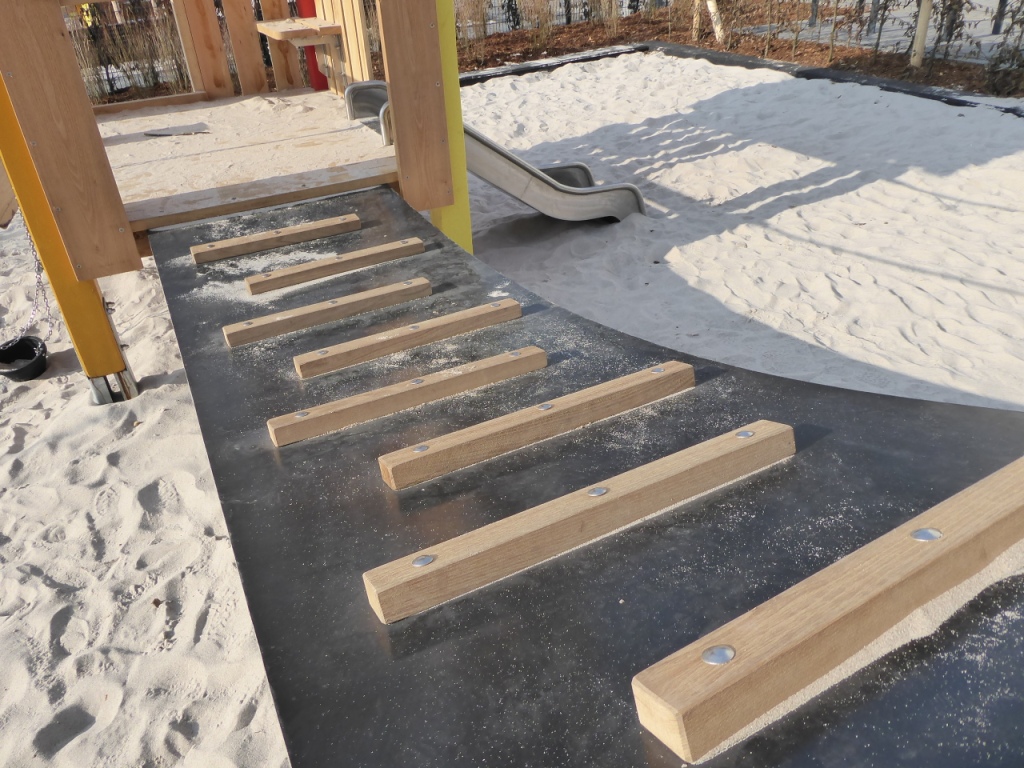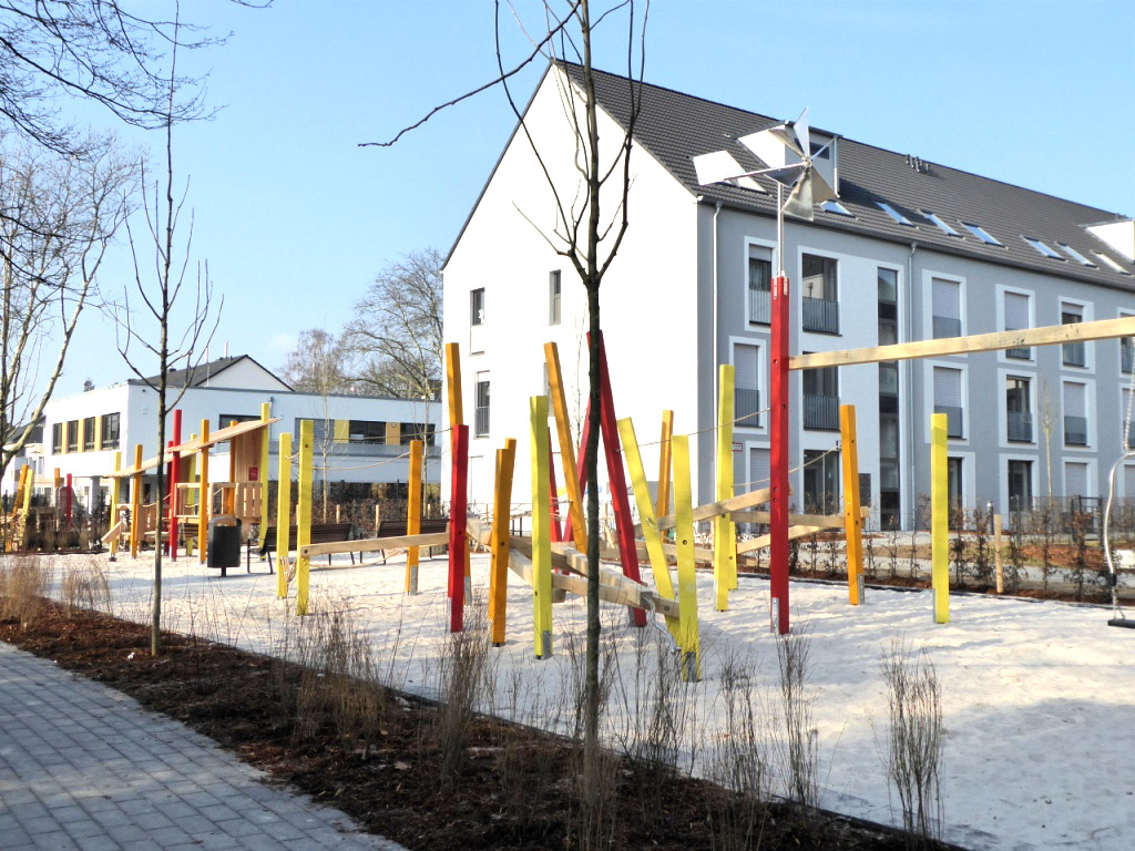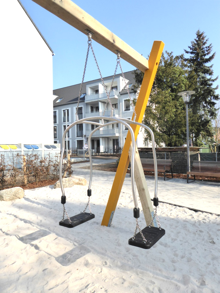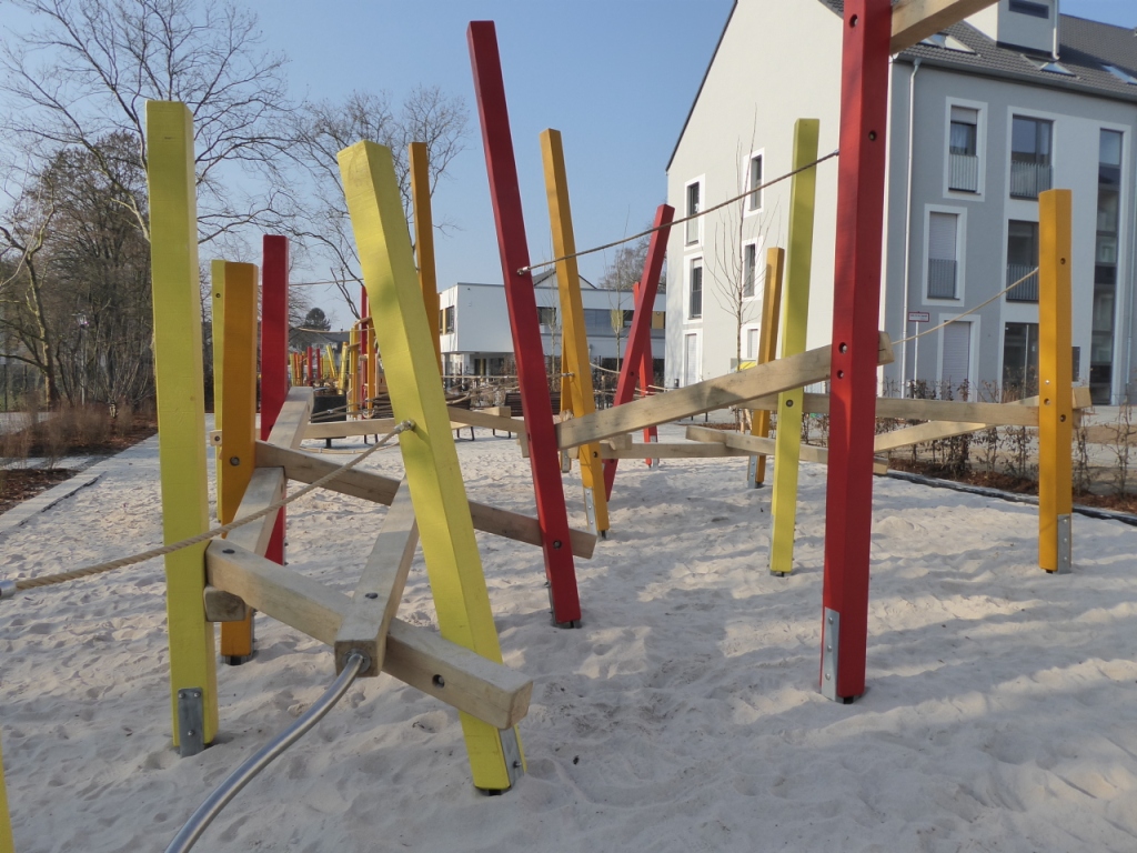 Ferner stehen zwei Spielhäuschen bereit, die zum Sandspiel und Rollenspiel auffordern. Die farbige und kantige Gestaltung setzt Akzente, die nicht nur Kinder, sondern bestimmt auch zufriedene Eltern anlocken wird.