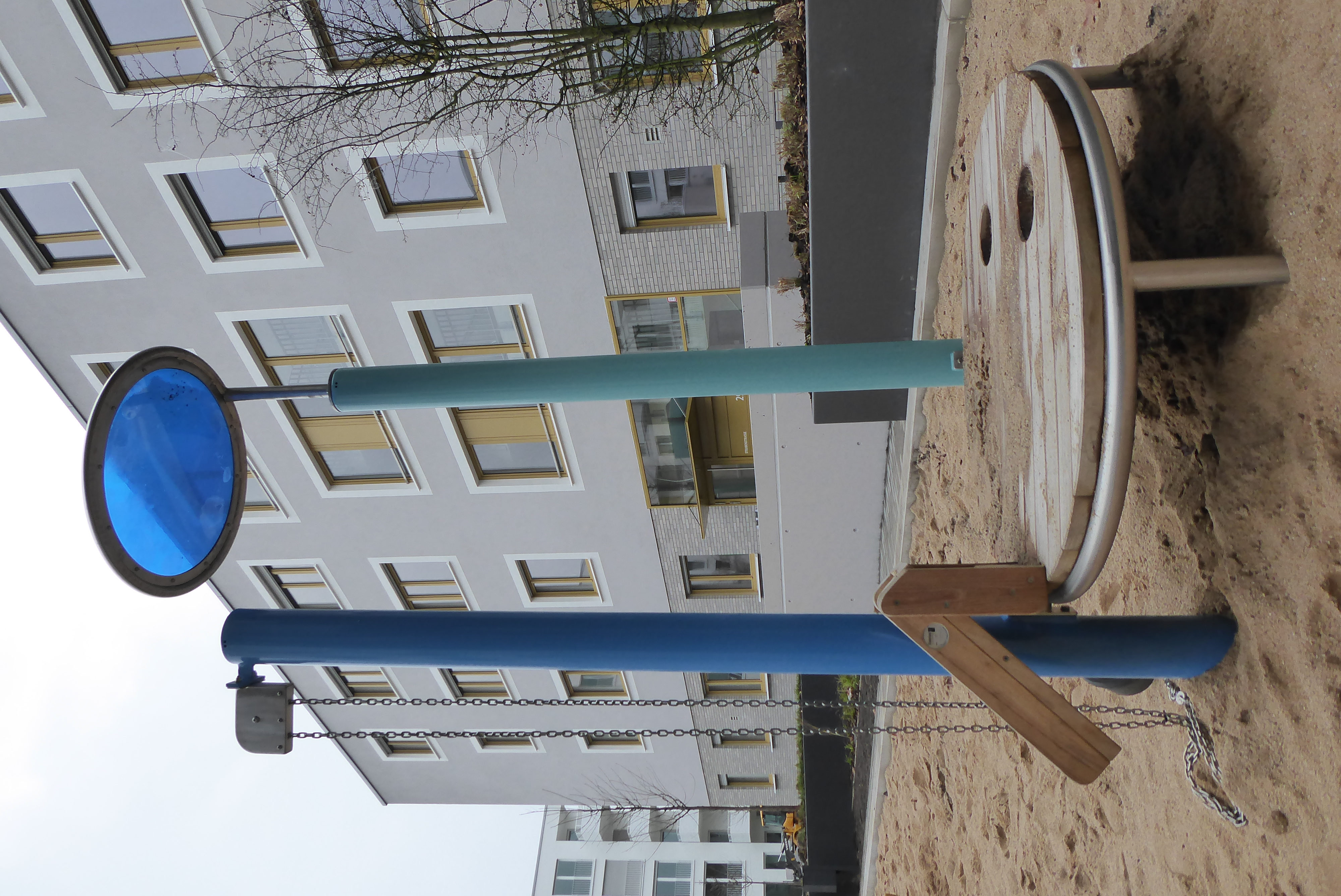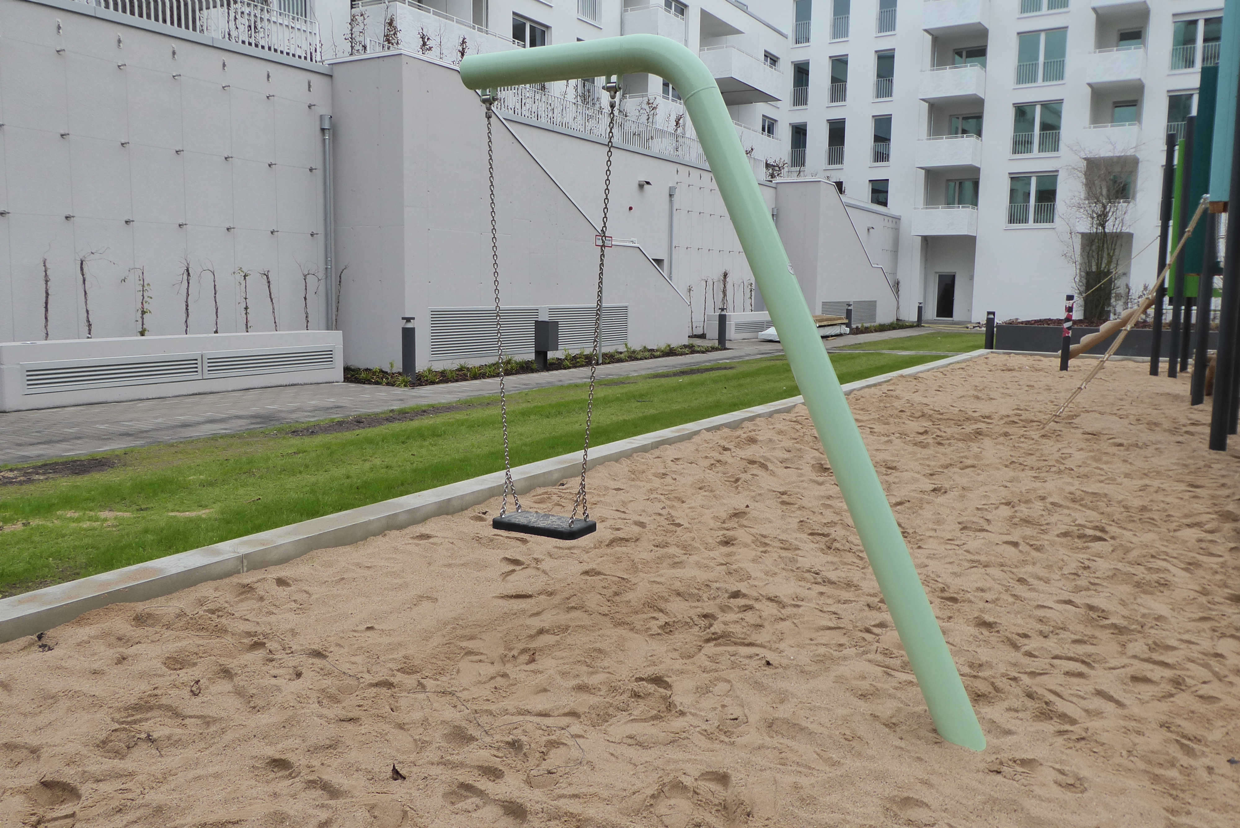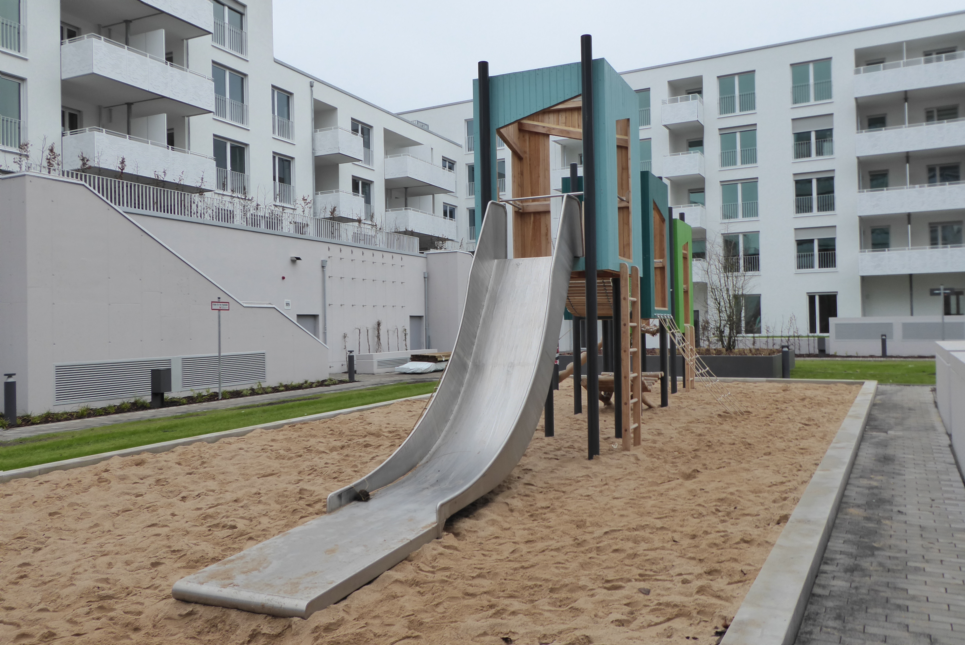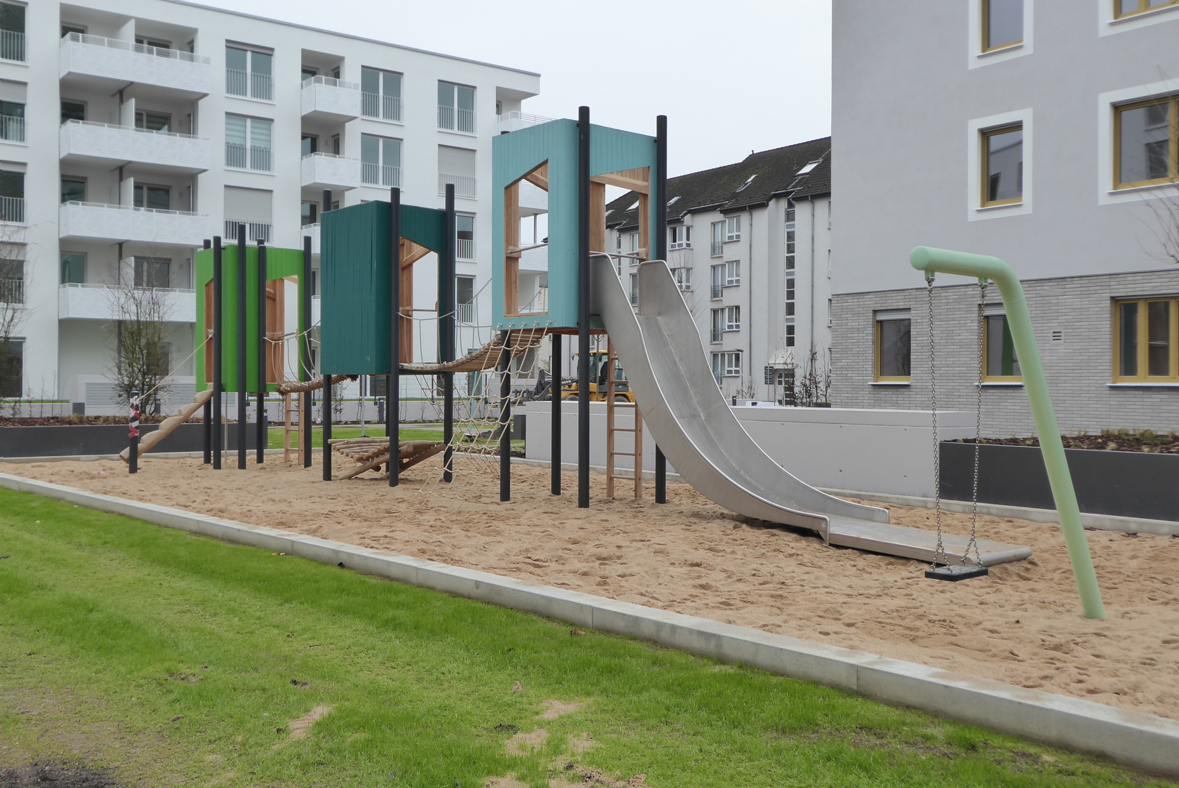 Gradlinige Spielanlage inmitten einer Wohnbebauung