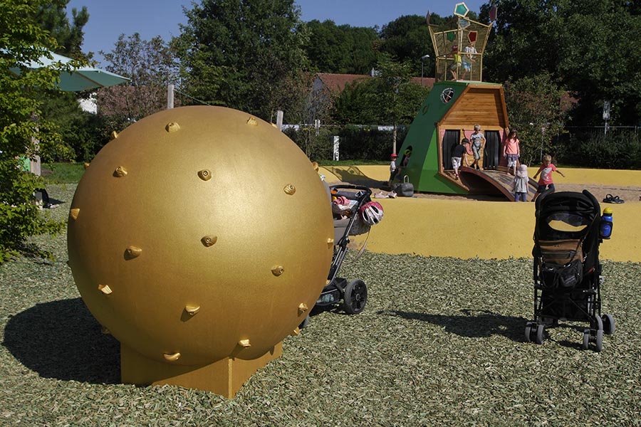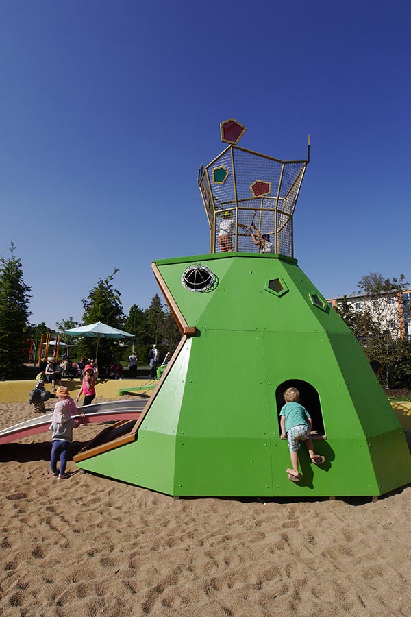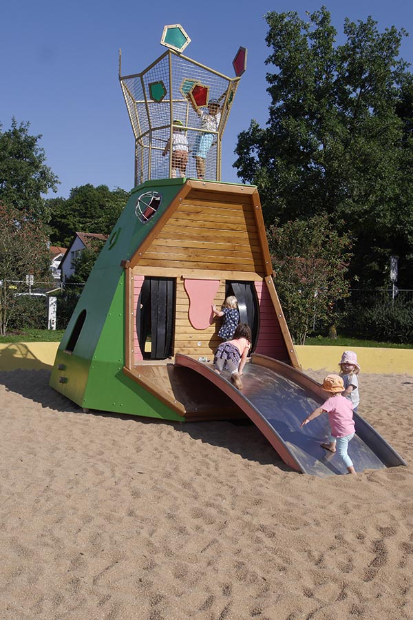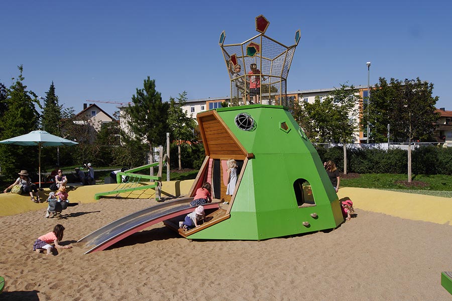 Ein Froschkönig so groß, dass die Spielenden sich klein wie Fliegen vorkommen können, lädt zum Spielen ein. In der Landesgartenschau Pfaffenhofen haben wir diese Märchenspielszene zum Leben erweckt. Der Frosch ist von Innen bekletterbar und die Krone mit ihren gefärbten „Diamanten“ lässt die Spielenden die Umwelt farbig sehen.
