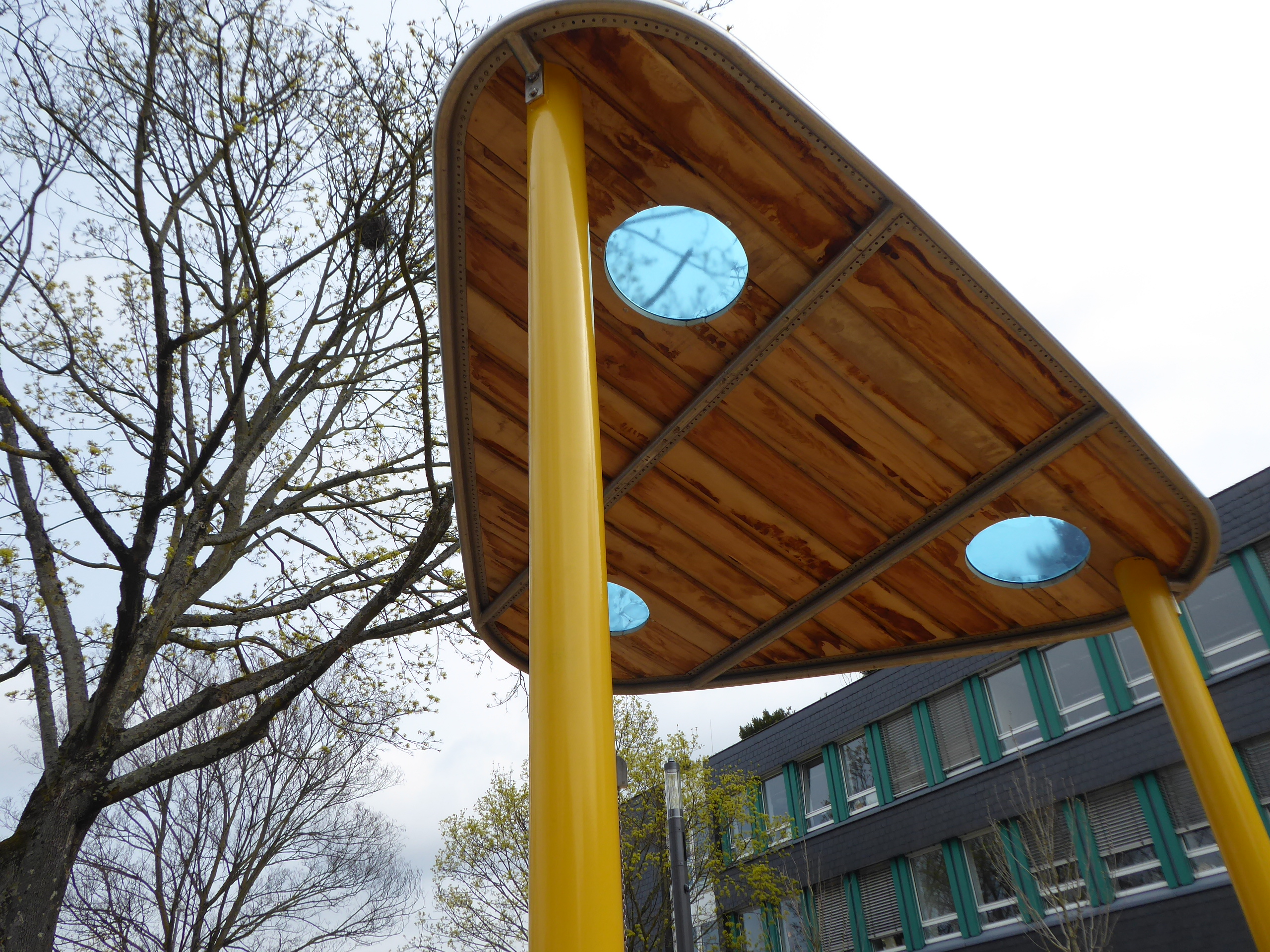 Spielhäuschen in fröhlichem Ginstergelb. Die Dachkonstruktion ist mit bunten