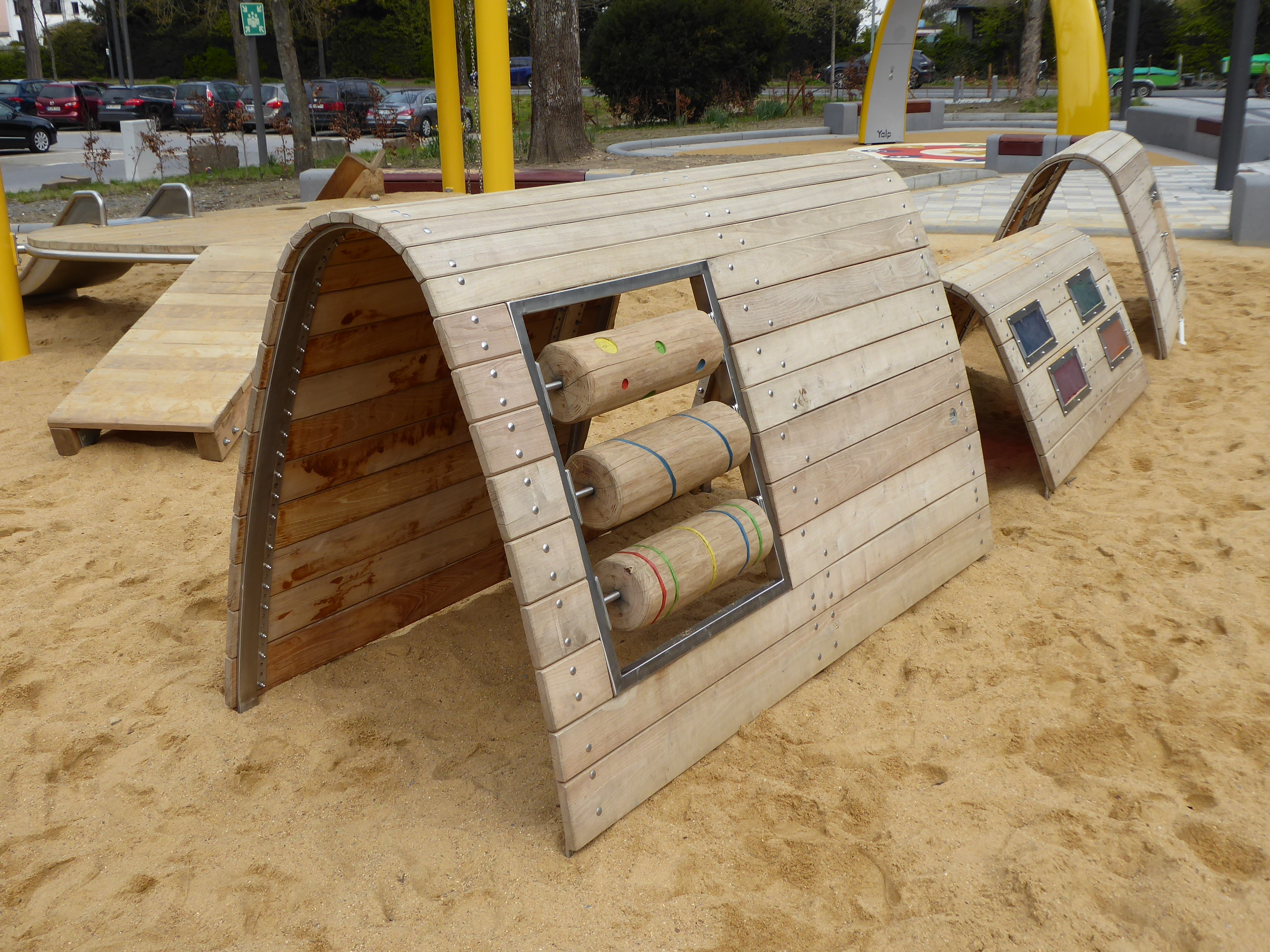 Weiter geht es in den dritten Tunnel. Das Augenmerk liegt hier auf Drehen und Schieben und somit auf der Motorik. Die unterschiedlich eingesetzten Materialien erzeugen jeder für sich seine eigene einzigartige Erfahrung. Drehhölzer mit Einkerbungen und aufgemalten Mustern erzeugen beim Drehen fantasievolle Bilder. Eine ganz andere haptische Erfahrung bietet das Schiebespiel mit Stahlkörpern in verschiedenen Formen und Größen sowie zwei drehende Steine.