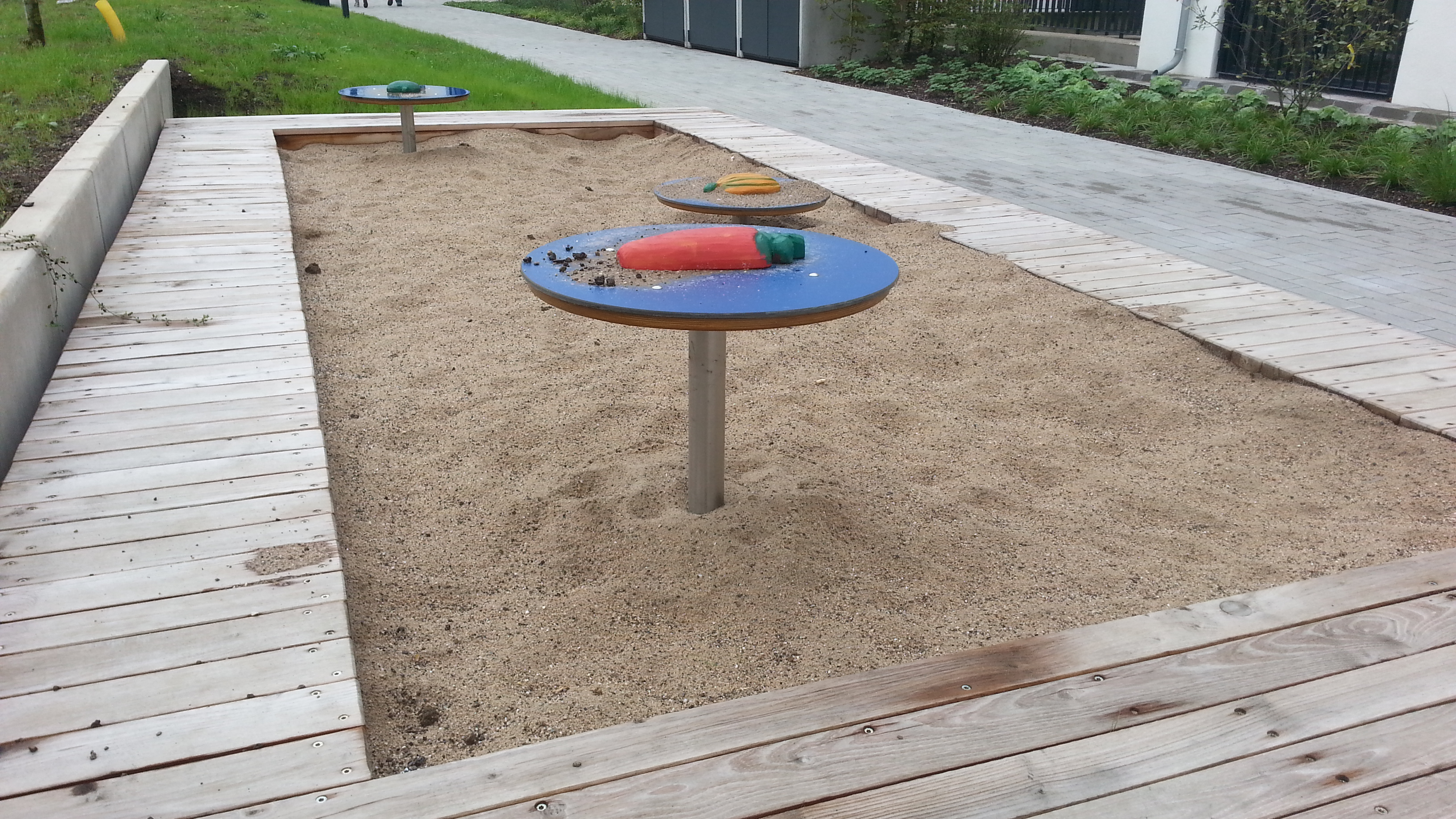 Alle Spielgeräte wie der Stangenkreisel, die Hängematte und die Sandspielanlage mit farbigem Lichtlolli entlang des Bachlaufs wurden auf einer Tiergarage montiert.