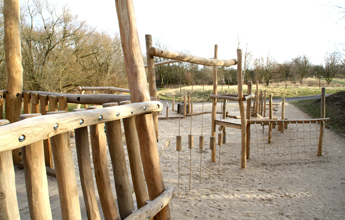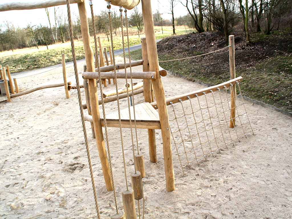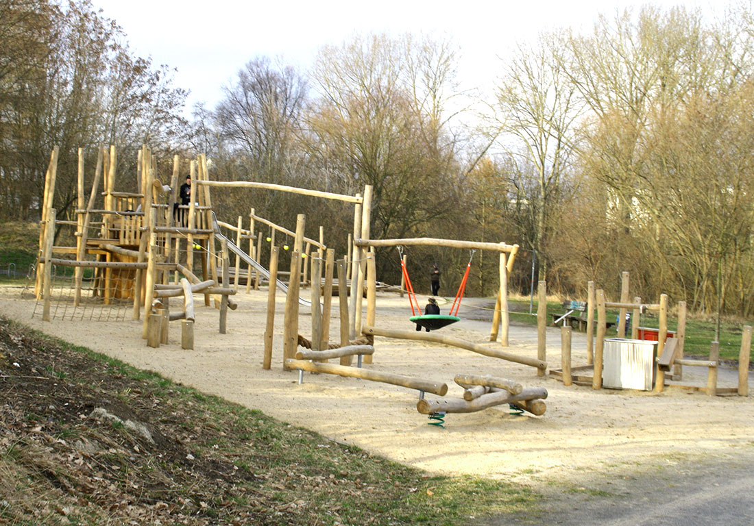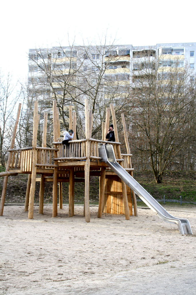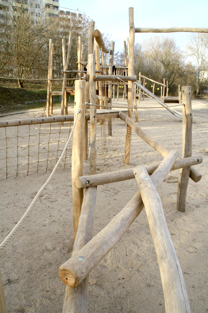Ein neue großzügige Spielanlage mit vielen Holzgeräten, wurde jetzt in Berlin errichtet. Es gibt mehrere Podeste, die auf verschiedensten Wegen per Leiter, Kletternetz oder über eine Kletterwand erklommen werden können. Nach dem Genießen des Blicks über den Platz wartet als Belohnung eine schnelle Edelstahlrutsche. Ansonsten gibt es reichlich Möglichkeiten sich hangelnd und kletternd fortzubewegen, z.B. an senkrechten Seilen, Balken mit hängenden Griffen, Steigstämmen oder einem Balanciermikado aus 6 Holzbalken.