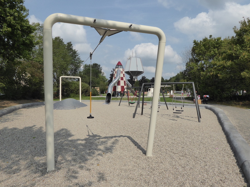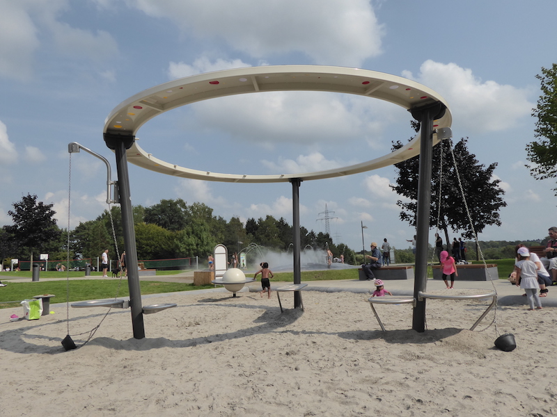 Das Landschaftsarchitekturbüro Förder aus Essen hat diese planerisch umgesetzt. Unteranderem sind dabei zwei Spielplätze, die sich an dem Thema Raumfahrt orientieren, entstanden. Hier prägen ein Rutschenturm in Raketenform und verschiedene Raumkapseln zum Klettern und Spielen das Bild.