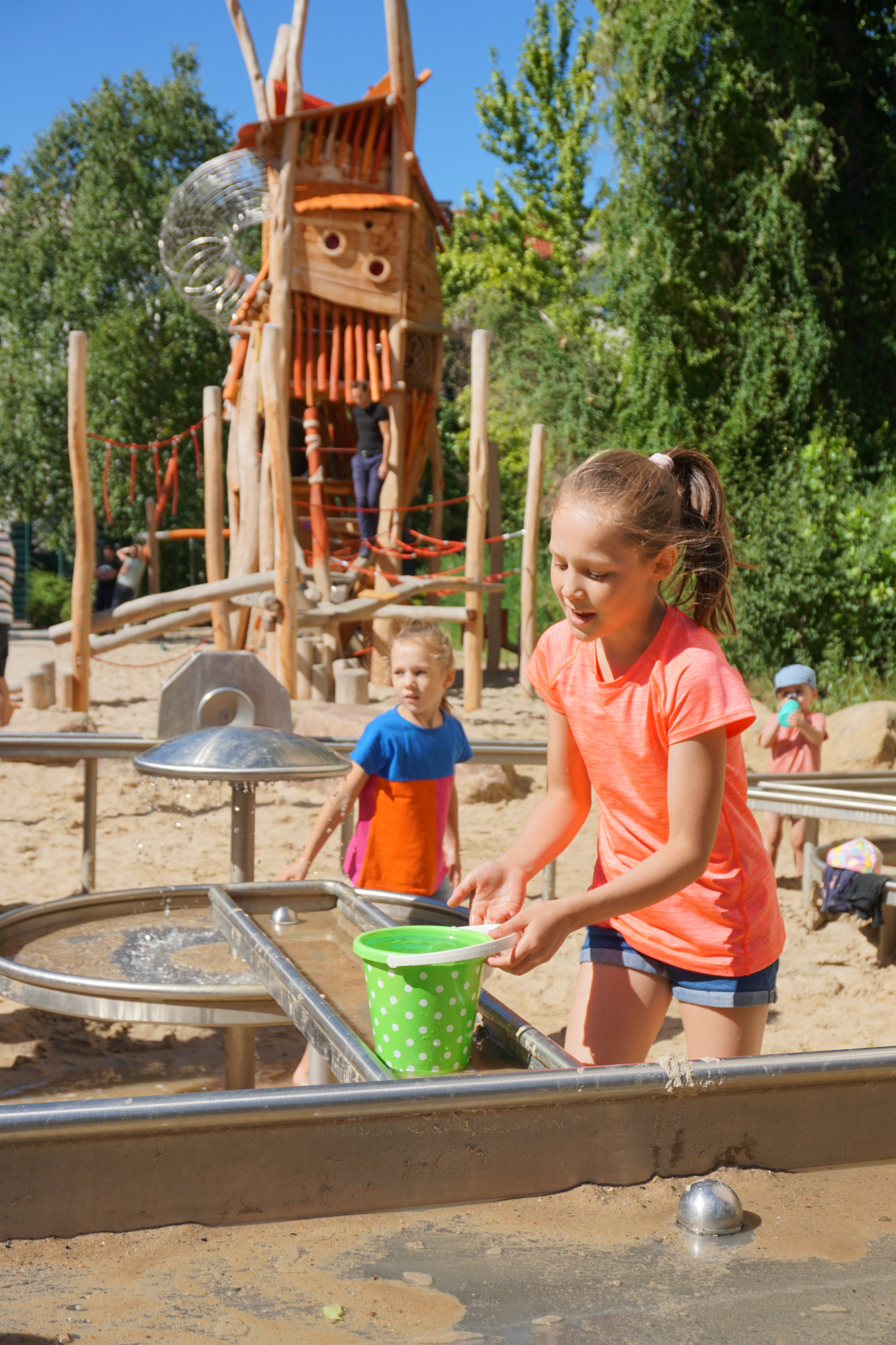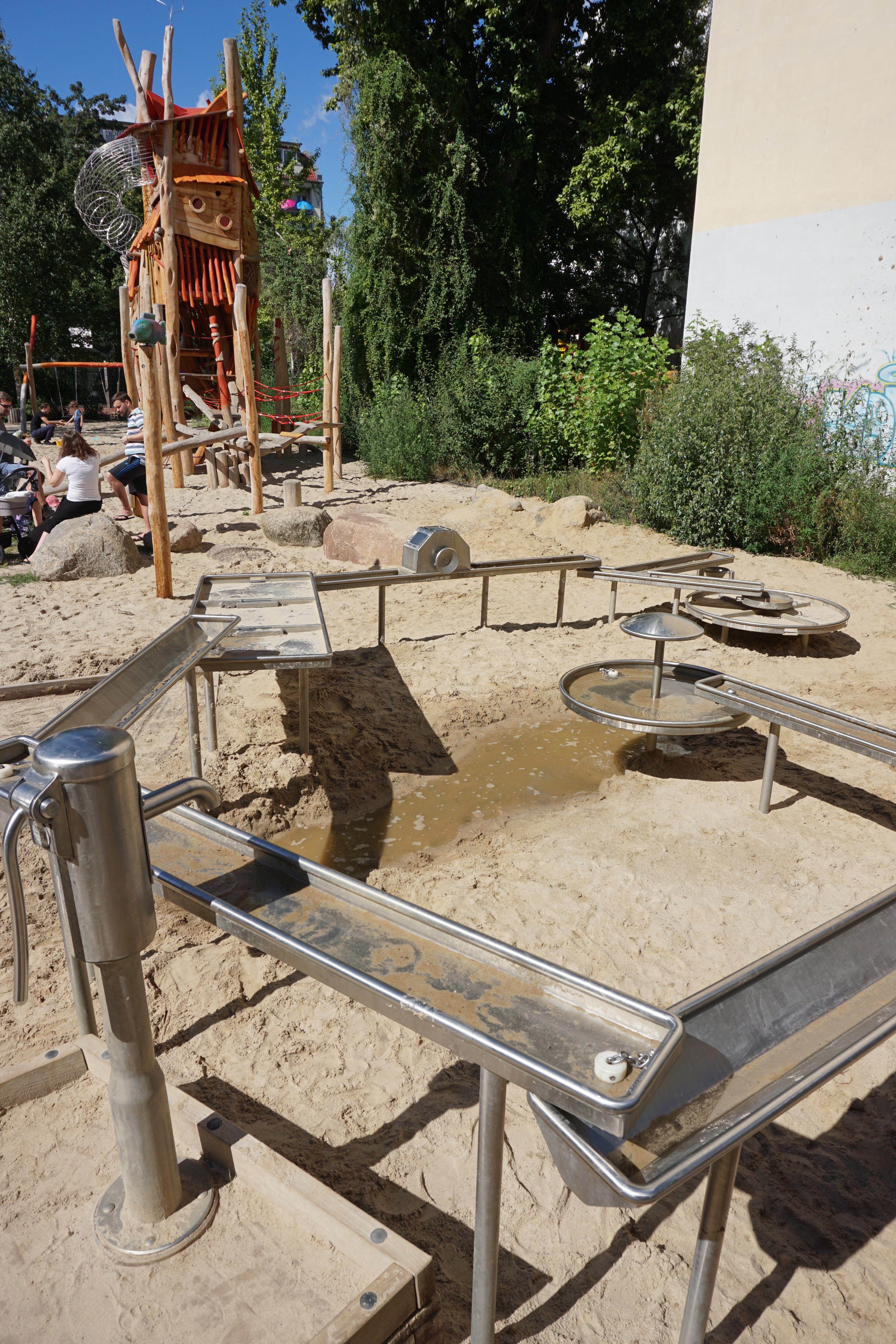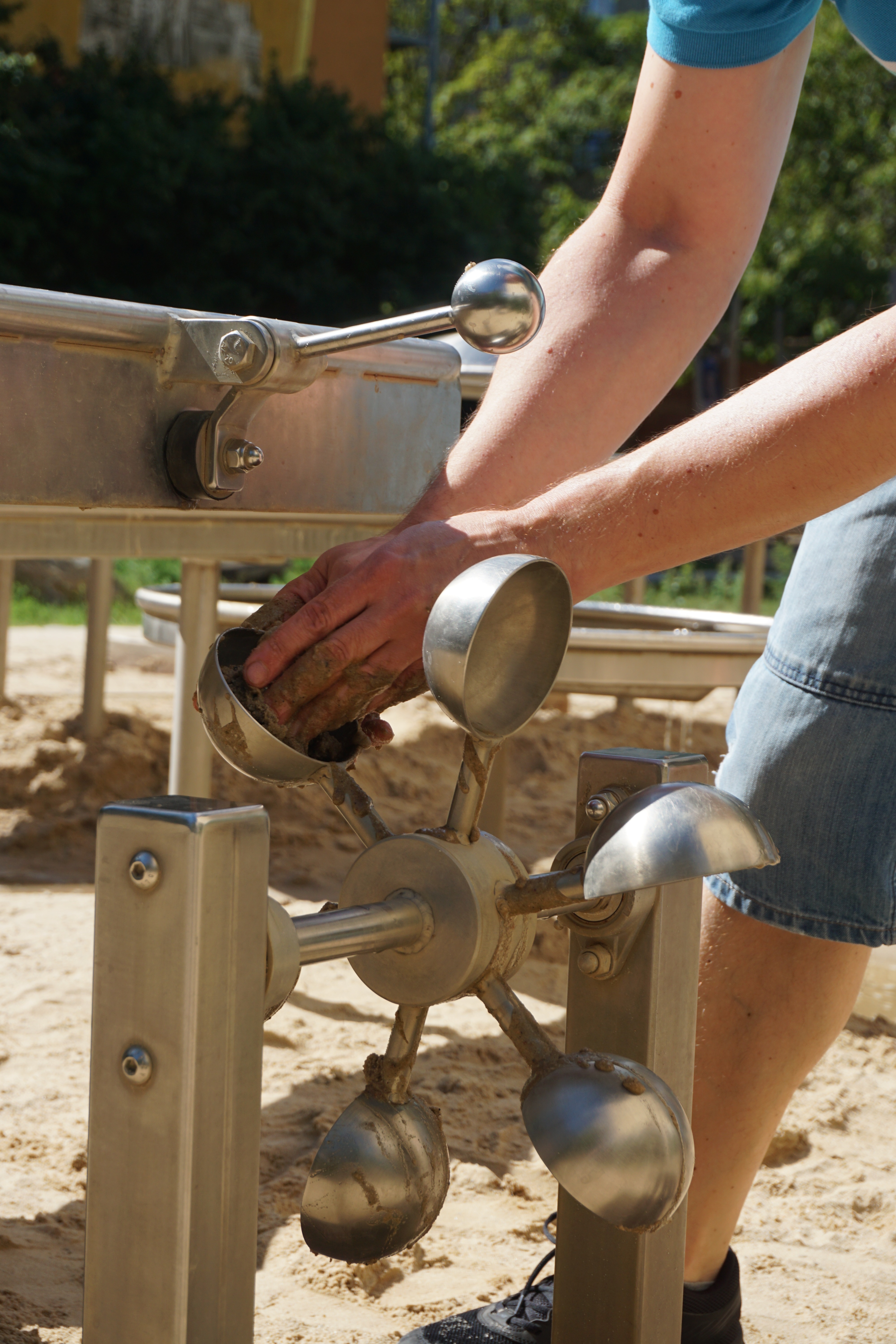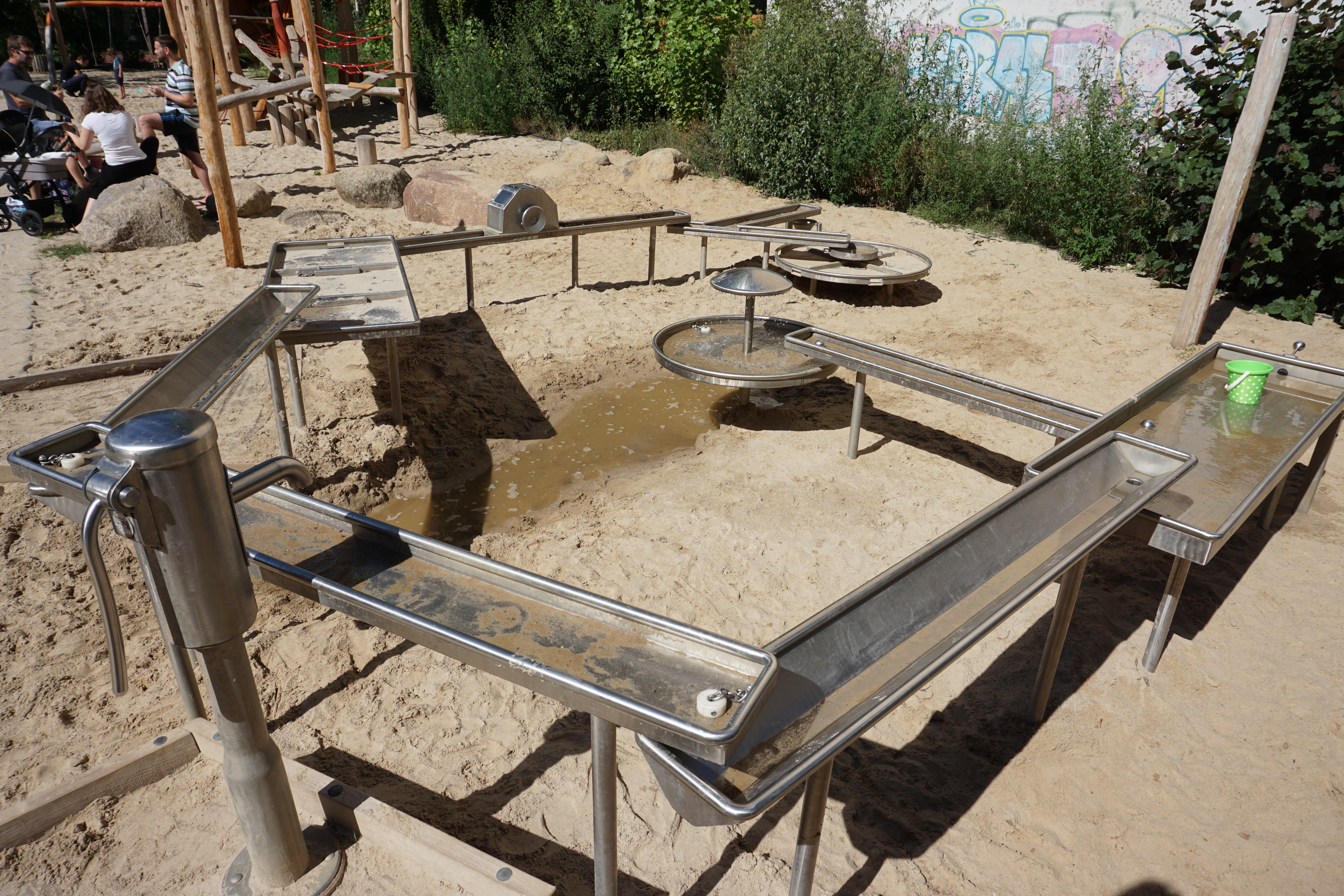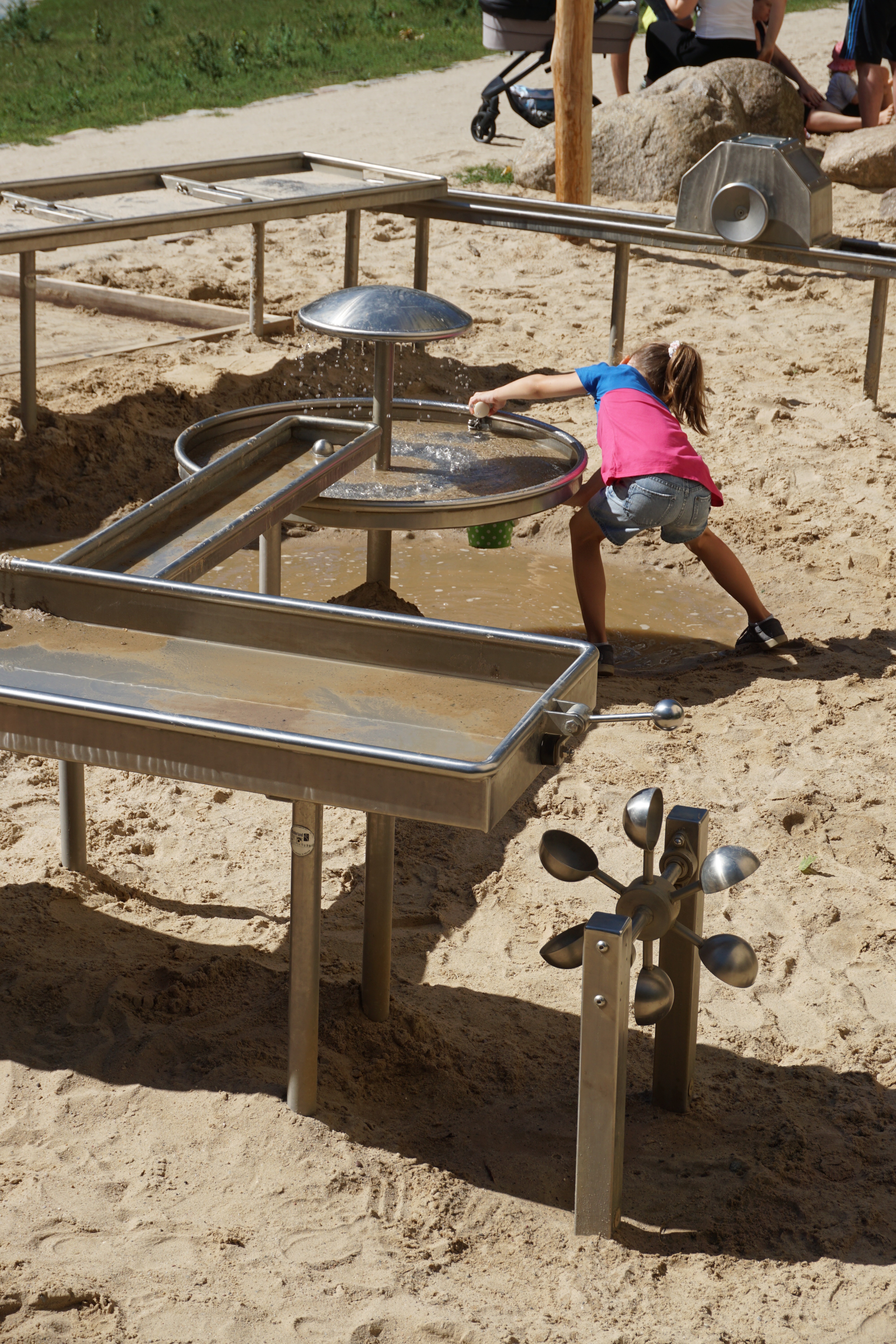 Verschiedene Pumpen die über ein Podest sogar mit dem Rollstuhl erreicht werden können laden alle Besucher zum munteren matschen ein. Von hier aus wird das Wasser über zahlreiche Wasserrinnen in unterschiedlichen Höhen zu den Matschtischen geleitet, in denen die Kinder kleine Burgen bauen können.