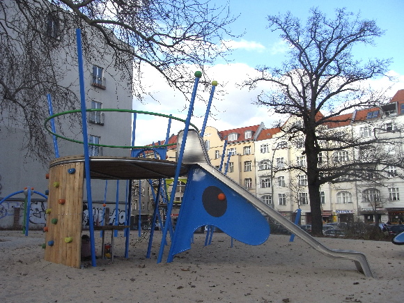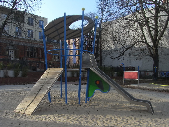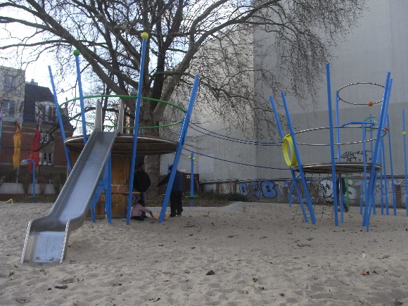 Thema des Spielplatzes in der Königin-Elisabeth-Straße ist "RAUMFAHRT". Dieses Thema ließ sich durch die Verwendung von Stahl aufgrund seiner Formbarkeit und gleichzeitiger Tragfähigkeit kreativ umsetzen.