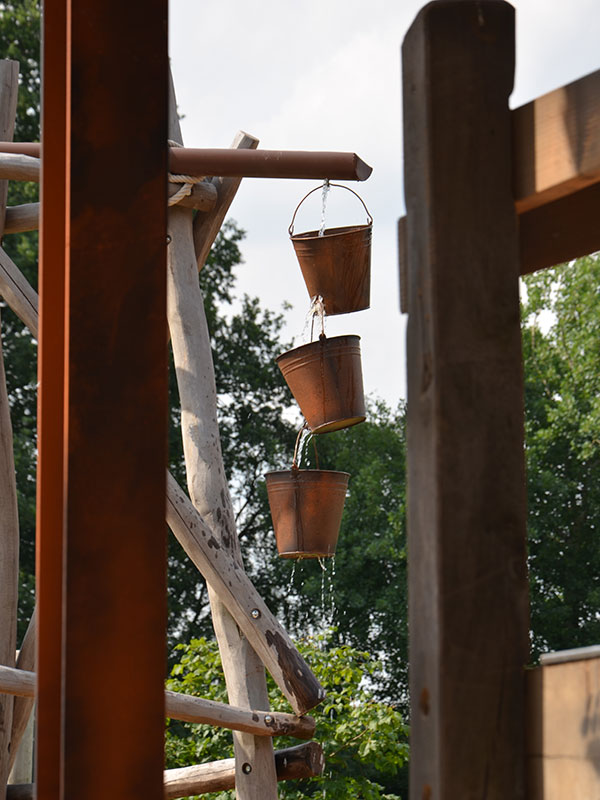 Die Kletterfertigkeit der Kinder kann auch auf dem hohen Förderturm bewiesen werden. Er hat mehrere Ebenen, die erklommen werden wollen. Am Turm ist eine große „Baumstammrampe“ in Form einer großzügigen Wasserrutsche. Sie ist extra breit und hat einen verlängerten Auslauftisch.