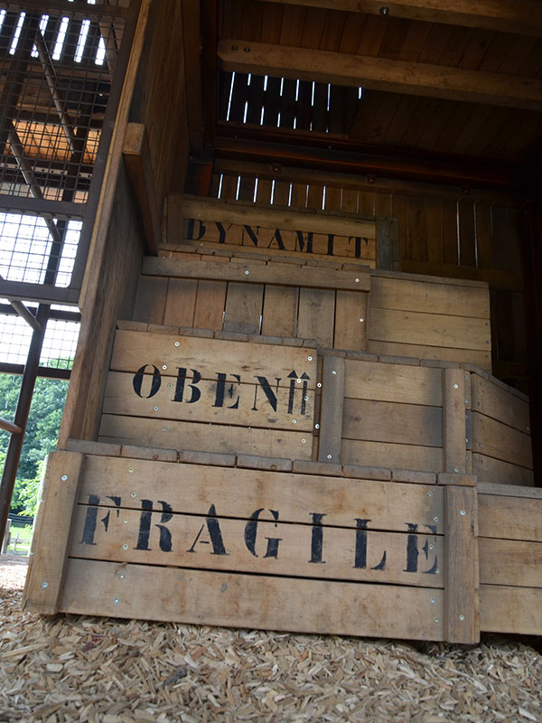 Zum Sägewerk, was spielerisch erkundet werden kann, gehört eine Lagerhalle, in der sich ein Kletterlabyrinth mit wild angeordneten Holzbalken befindet. Diese sind teilweise leicht wackelnd und beweglich aufgehangen.