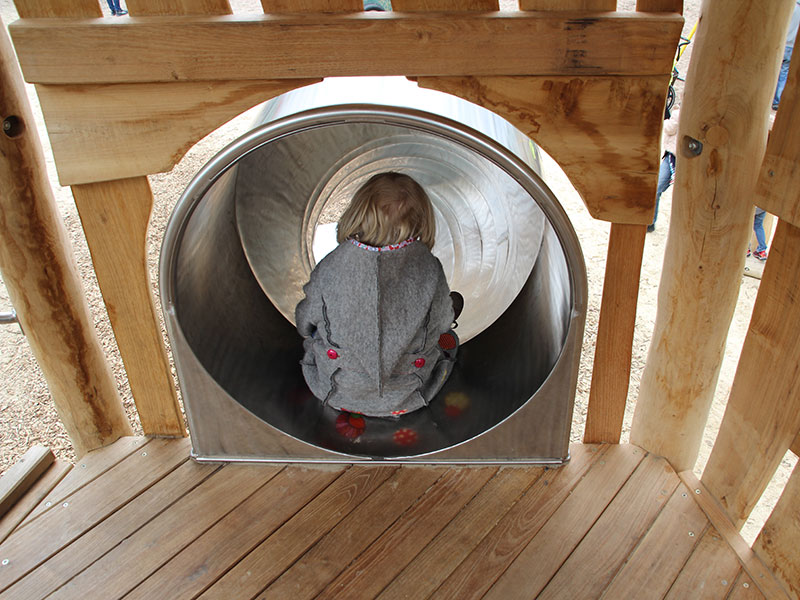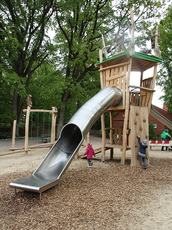 Abgerundet wird die Anlage schließlich von einem weiteren Spielturm, der mit einem schrägen Sprossenaufstieg, einer breiten Edelstahlrutsche und einem Kletternetzaufstieg am Hügel ausgestattet ist. So kann der Turm mit Geschick und Kletterkunst erobert werden.